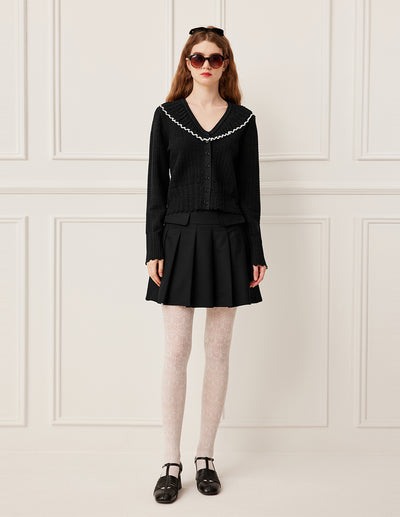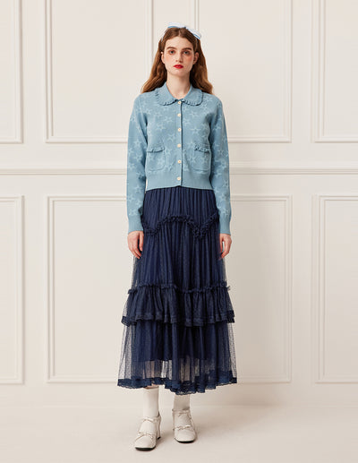 BORA AKSU Round Neck Ruffle Trim Vintage Jacquard 100% Wool Knit Cardigan
