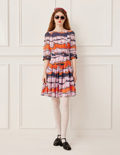 BORA AKSU Mandarin Collar Vine Print Tie-Waist Pleated Midi Dress