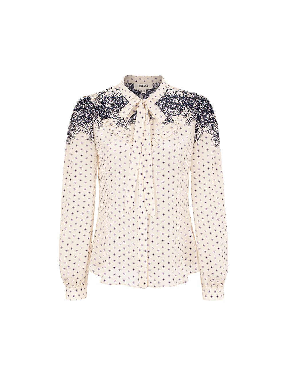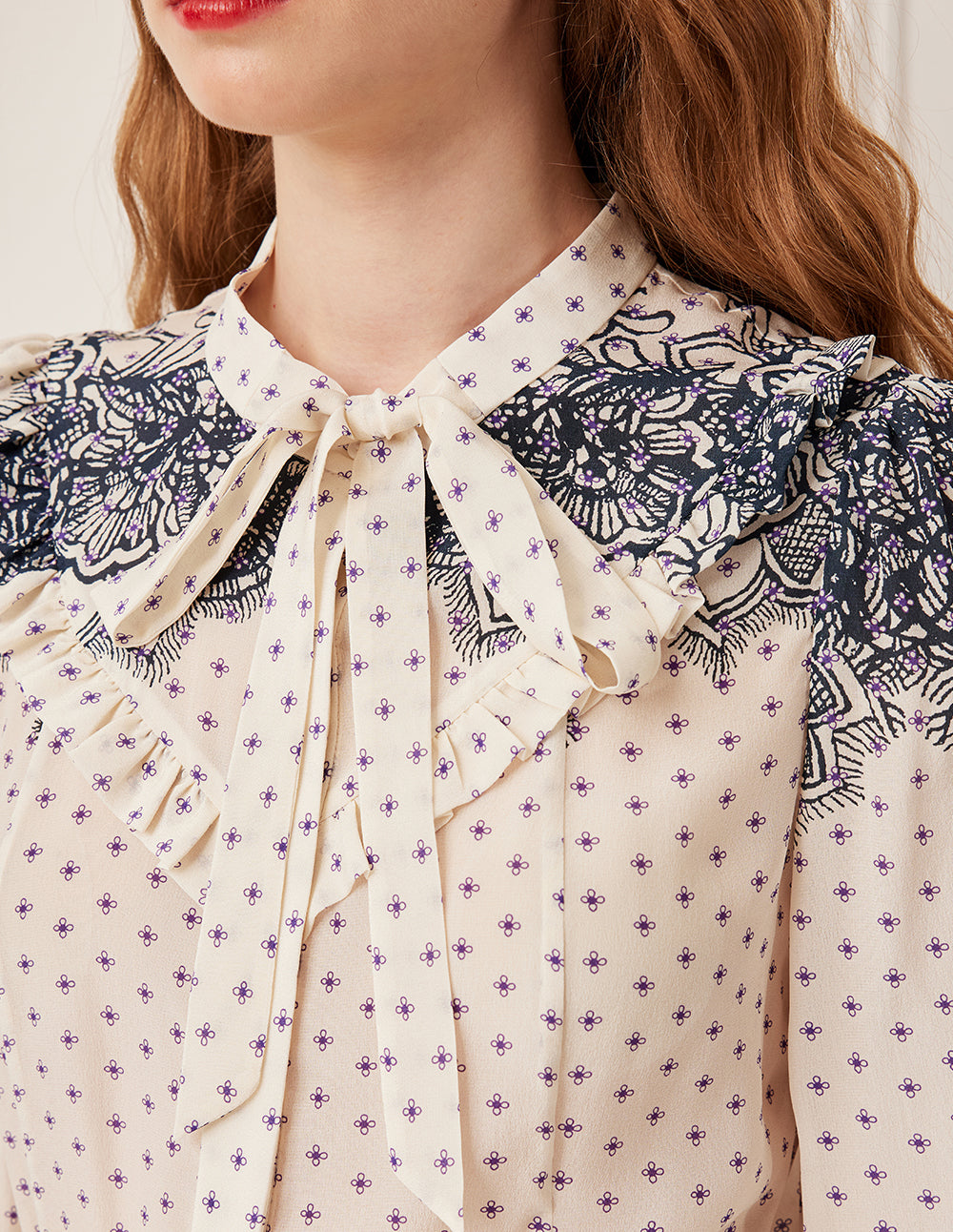 BORA AKSU Tie Ruffled Detail Polka Dot Floral Lace Print Long Sleeve Blouse