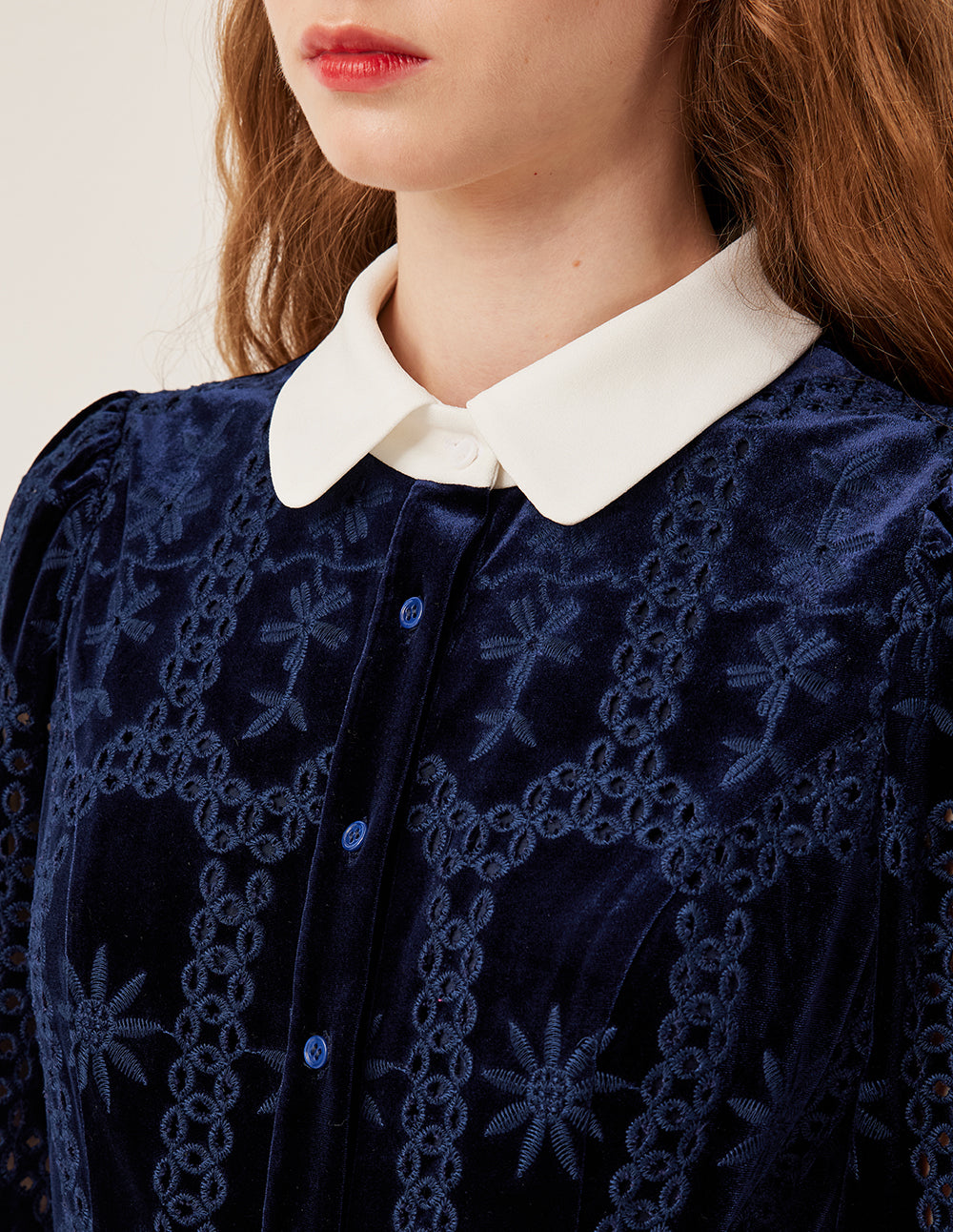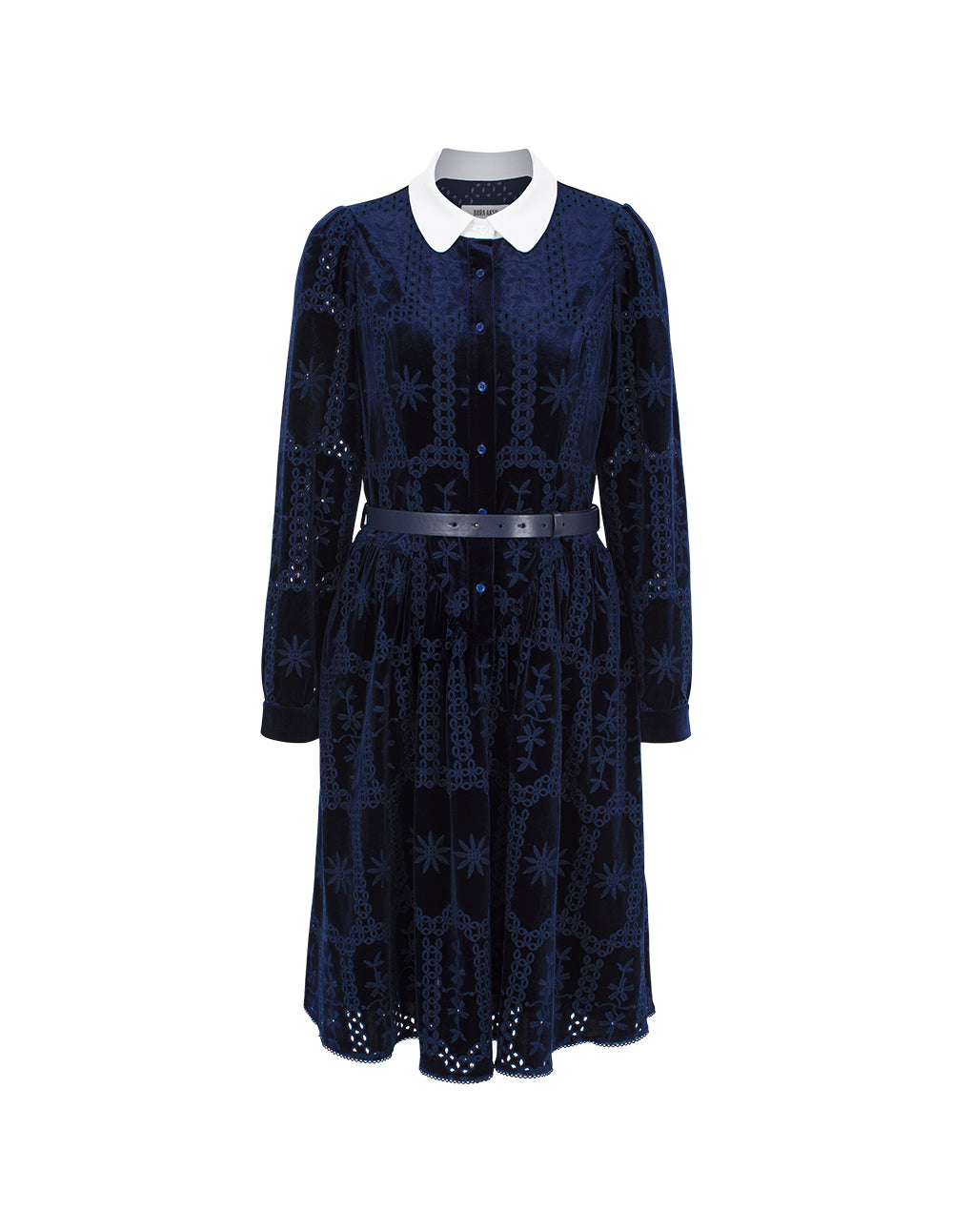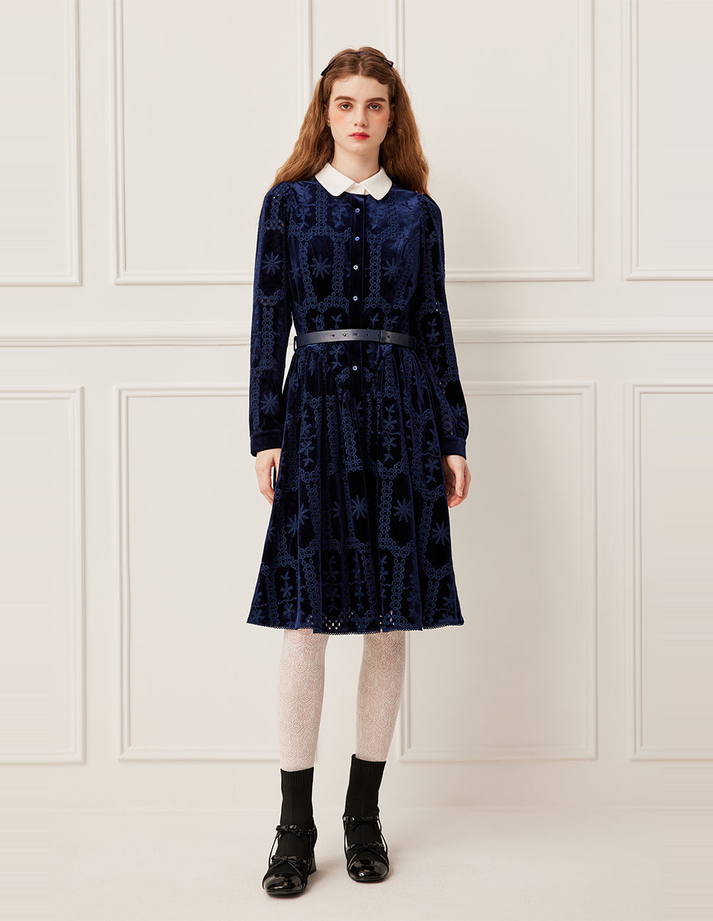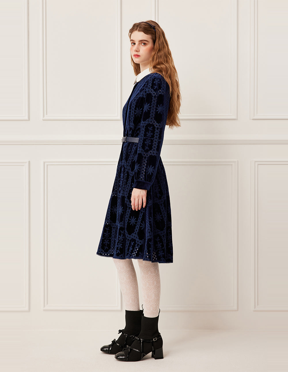 Amidst a deep navy velvet base, a white lapel and midnight blue jacquard create a dramatic elegance. The faint, light-colored jacquard evokes starlight across the night sky, while deep blue outlines create a delicate pattern. Lightly padded shoulders and puff sleeves evoke the glamour of the golden age, while a leather belt cinches the waist. The long velvet skirt drapes fluidly, exuding a luxurious feel with every step. Whether at a dinner or a formal occasion, this dress will make you the most dazzling presence.