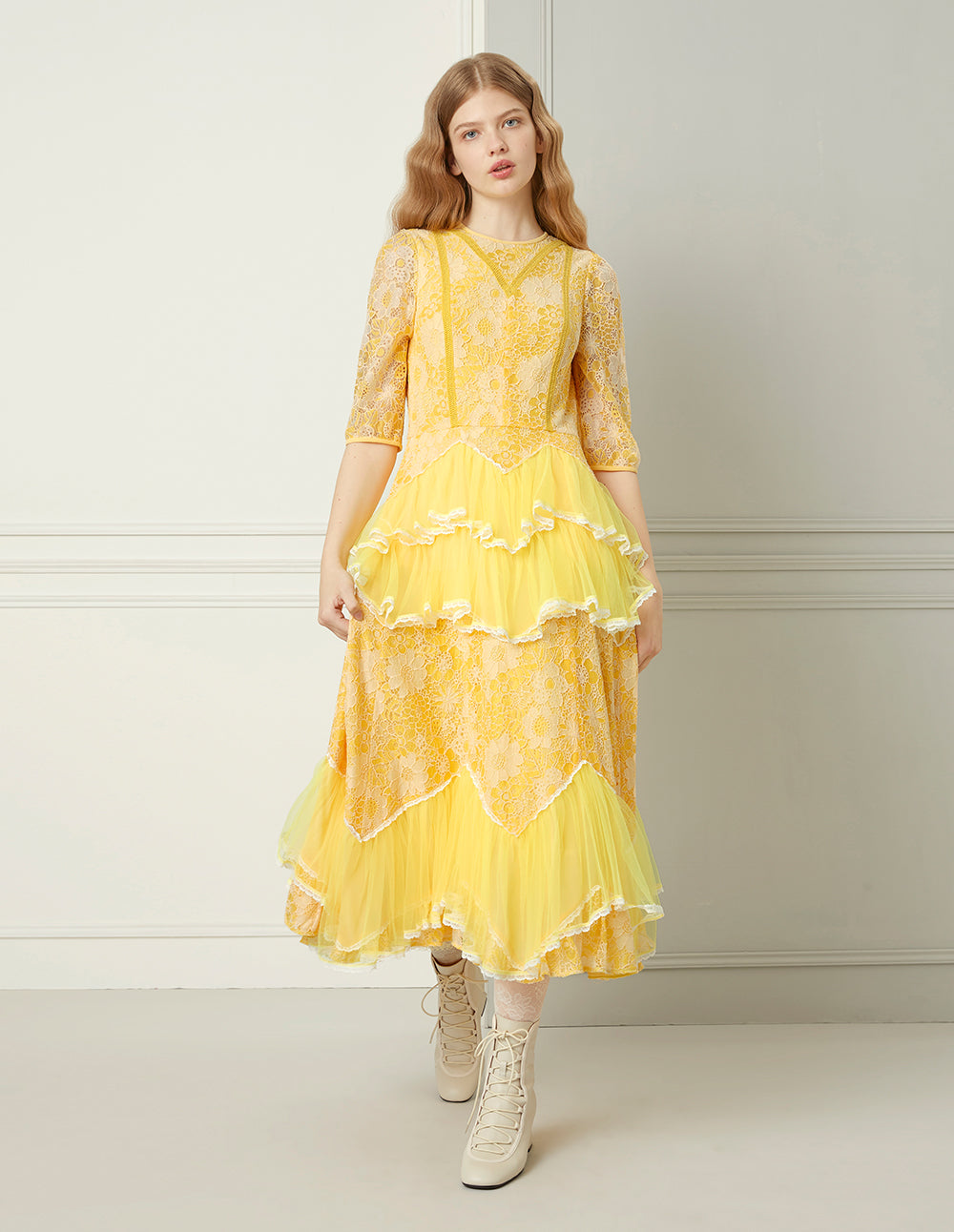 BORA AKSU Daffodil Mesh Ruffled Lace Mid-Sleeve Long Dress