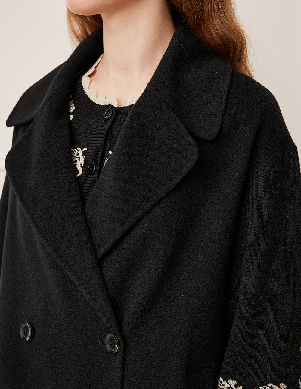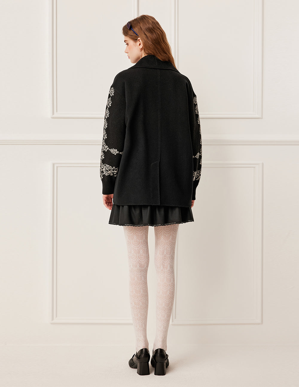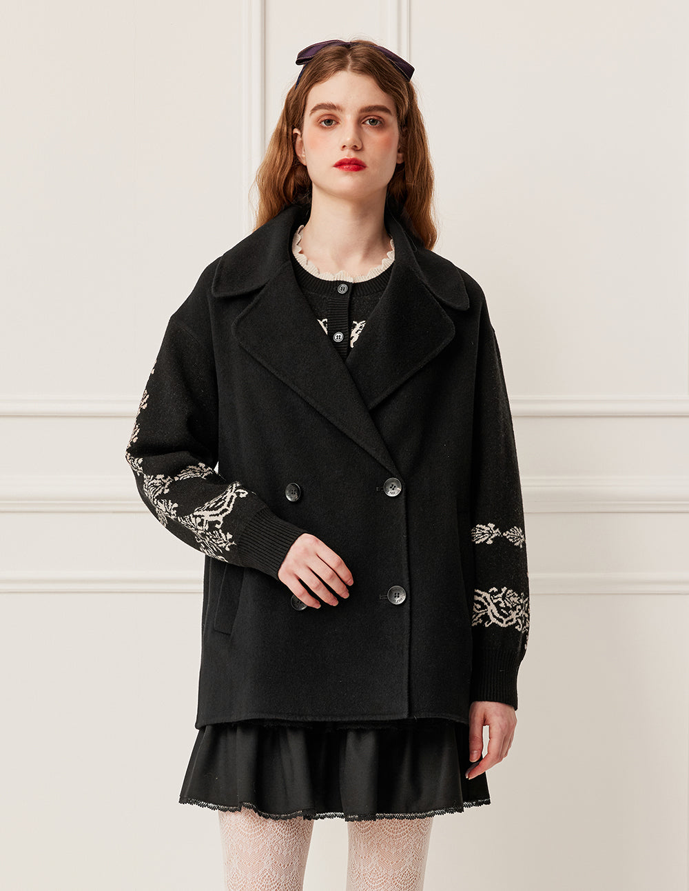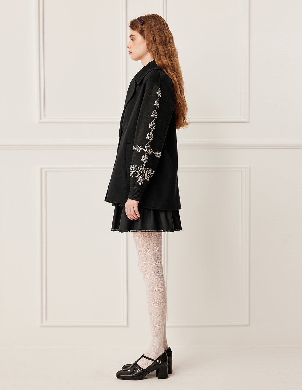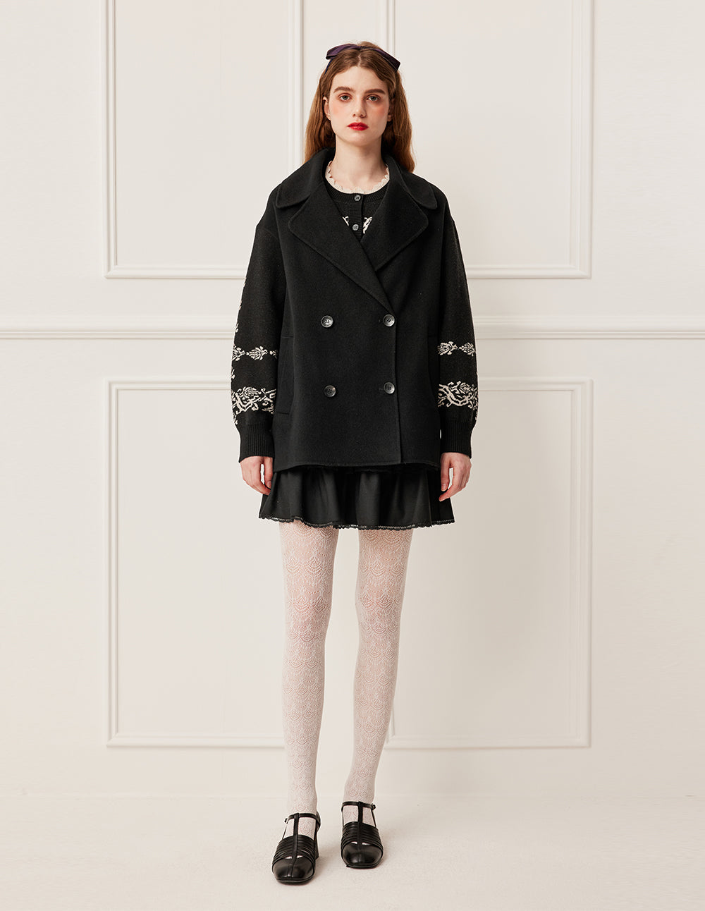 Inspired by the autumn corridors of a vintage manor, this jacket features apricot jacquard pattern on a black background, tracing the lines of time. A wide lapel extends to the shoulder line, while vine jacquard patterns appear faintly on the sleeves. The neatly arranged double-breasted buttons continue the sleekness of a classic military uniform, offering warmth and elegance amidst the cool autumn air.