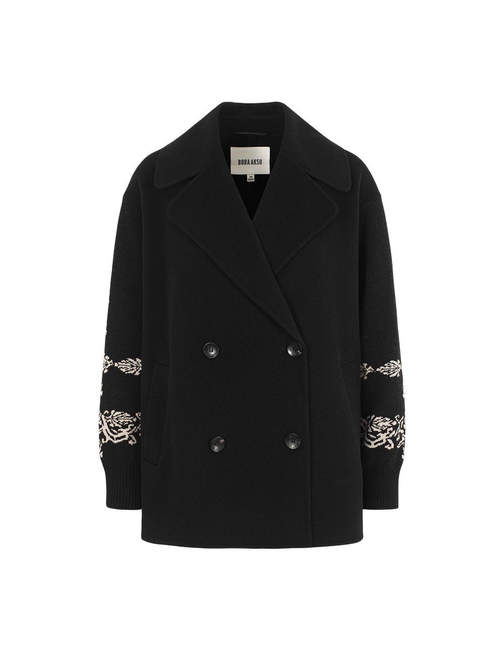 BORA AKSU Notched Collar Double-Breasted Beige Jacquard Coat