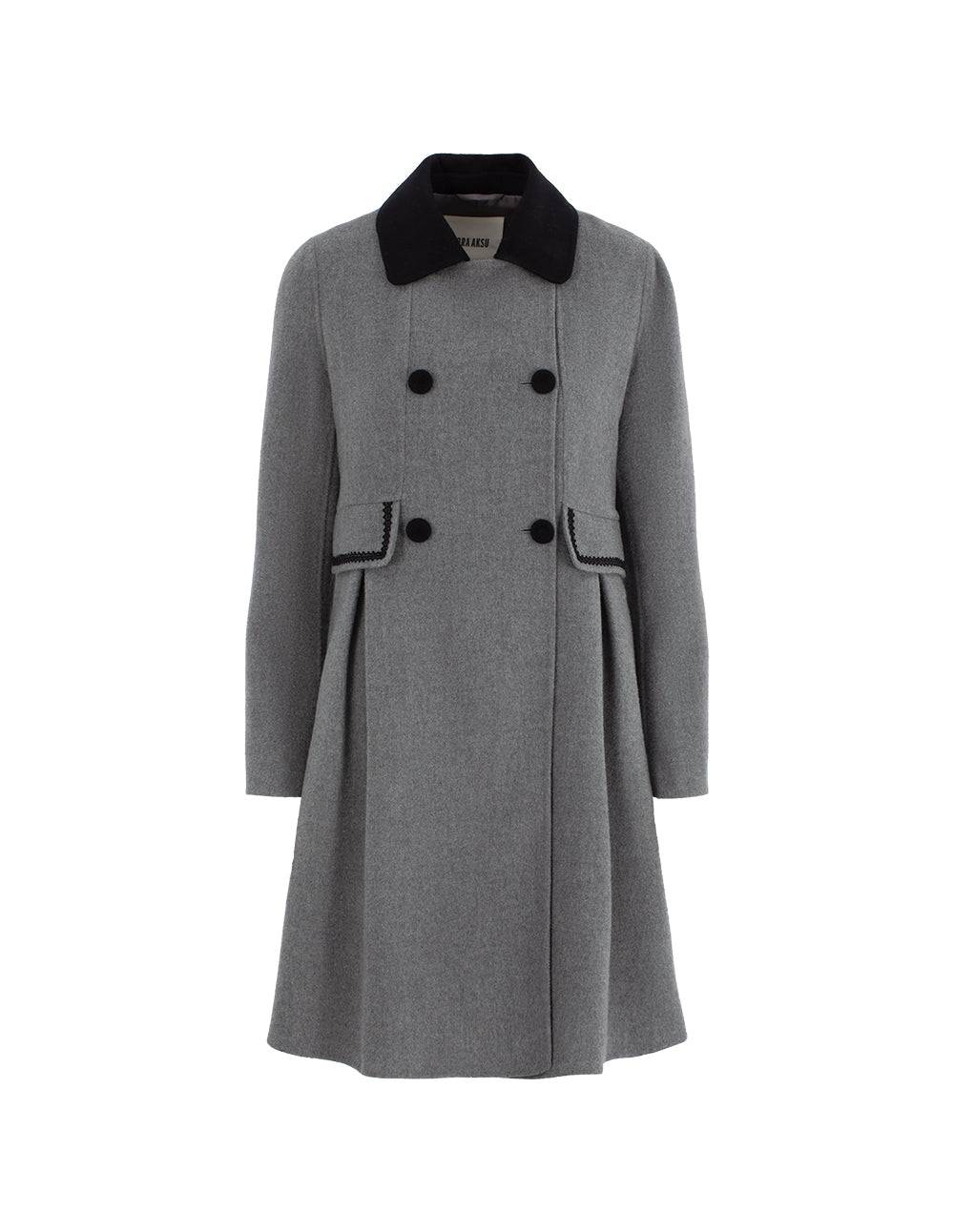 This sleek, sleek jacket embodies timeless elegance in a rich grey hue, while its black double-breasted design and lapel create a classic silhouette. Its smooth, flattering H-cut silhouette cleverly flatters the figure, while symmetrical flap pockets at the waist conceal lace details for an instantly refined look. Its double-faced fabric ensures warmth without bulk. Whether paired with a dress for a vintage-inspired elegance or paired with trousers for a sophisticated look, it's a must-have for any fall/winter wardrobe.