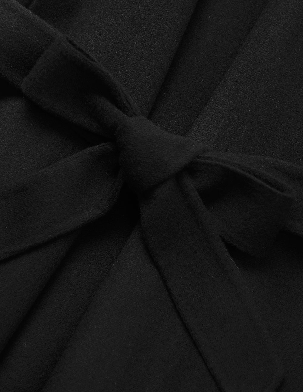 This design interprets the languid elegance of a "bathrobe-style" coat with a modern touch. The all-black color scheme is deep and sophisticated. Its key design element lies in the oversized lace lapel that winds from the shoulders to the placket, resembling a casually draped black scarf. The edges are outlined with delicate lace, swaying gracefully with each step, creating a dynamic and beautiful effect.