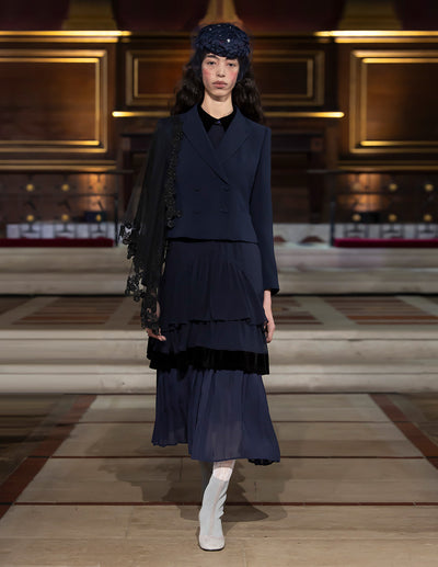 BORA AKSU Luxurious Velvet Collar Sheer Long Sleeve Multi-Layer Ruffle Midi Dress