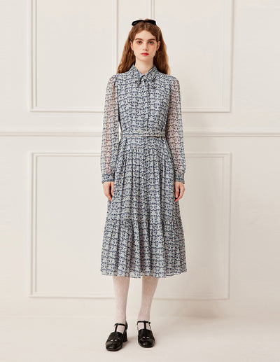BORA AKSU Bow Ribbon Long Sleeve Hand-Painted Bird Print Pleated Midi Shirt Dress