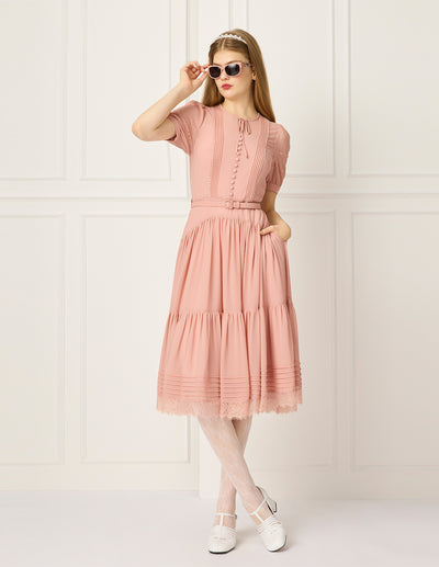 BORA AKSU Collared Bow Bubble Sleeve Pleated Midi Dress
