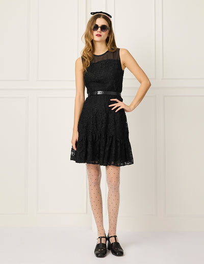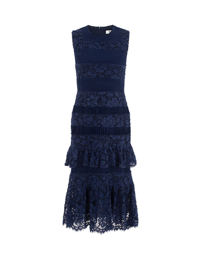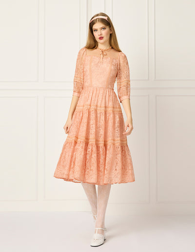 BORA AKSU Ruffled Round Neck Sheer Lace Long Sleeve Midi Dress