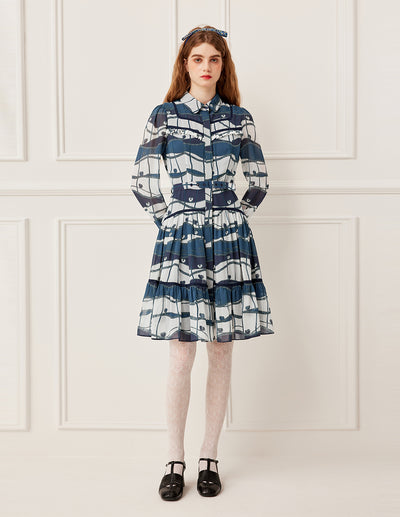 BORA AKSU Long Sleeve Blue Ocean Print Pleated Midi Dress