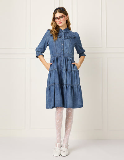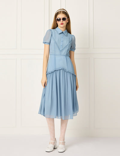 BORA AKSU Layered Ruffle-Trim Long Sleeve Pleated Midi Shirt Dress