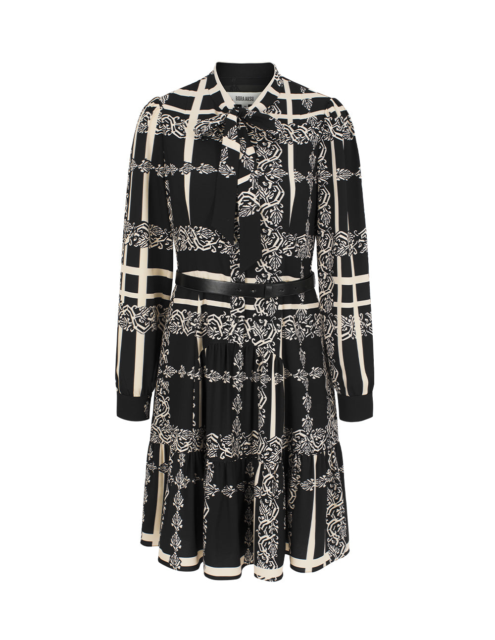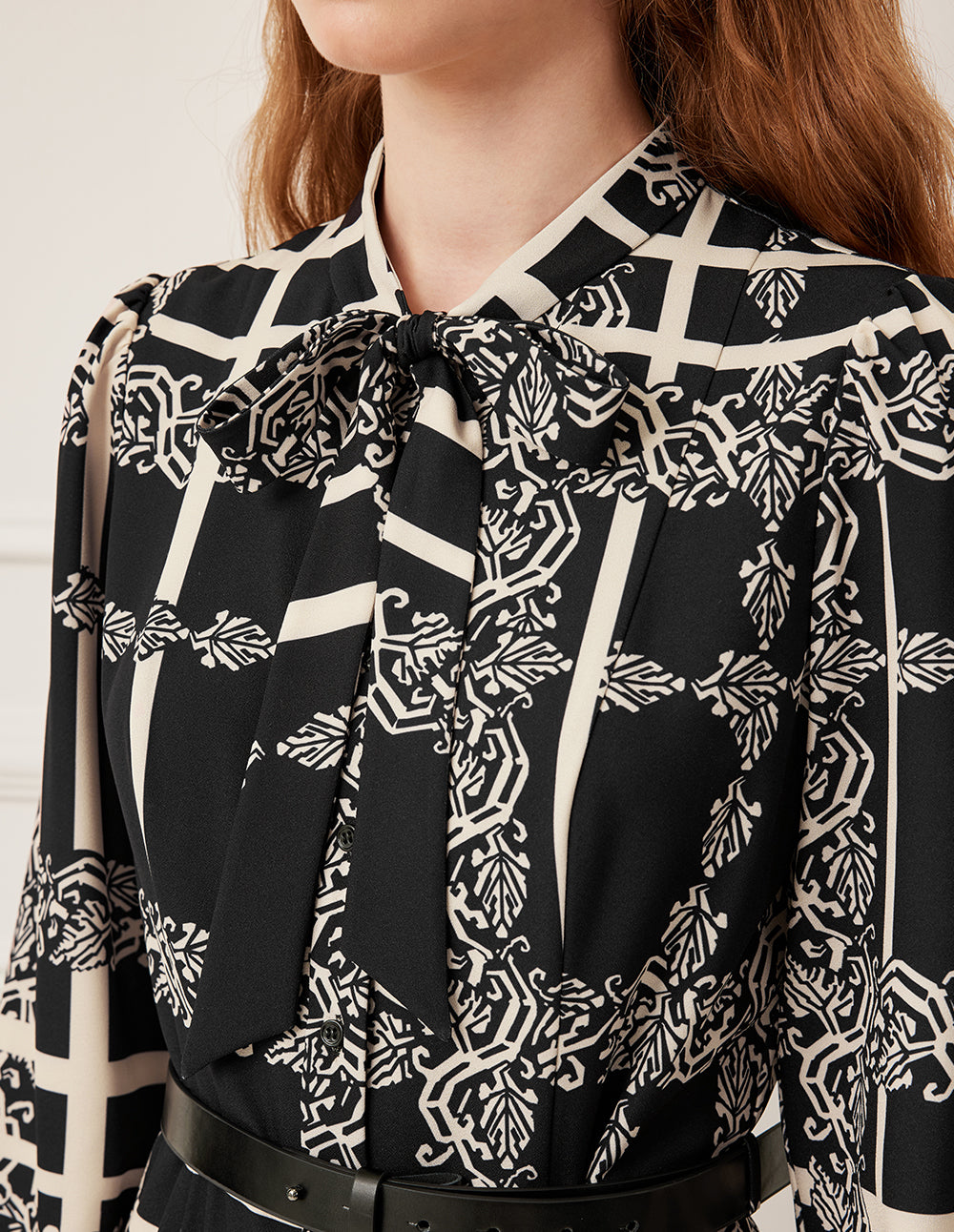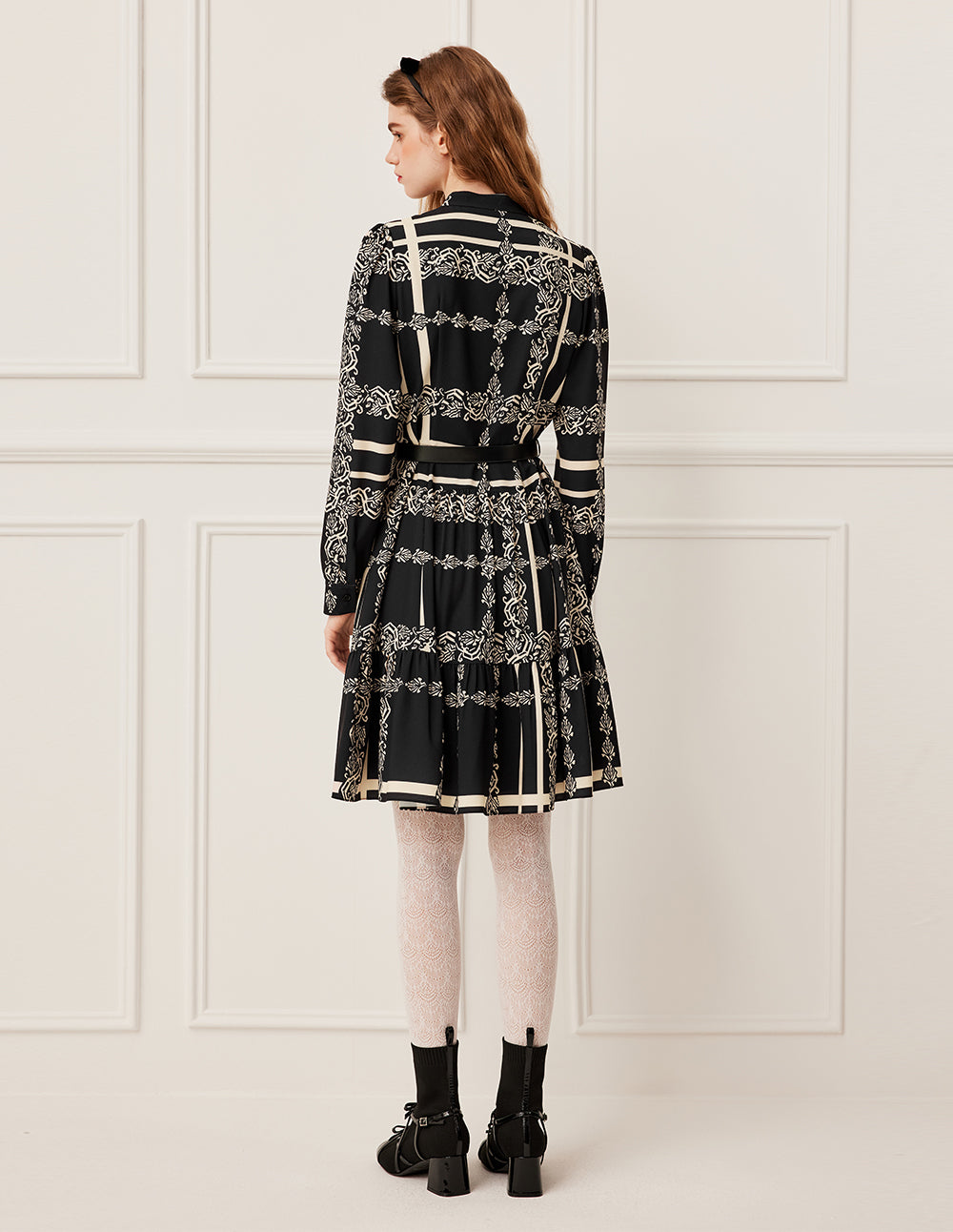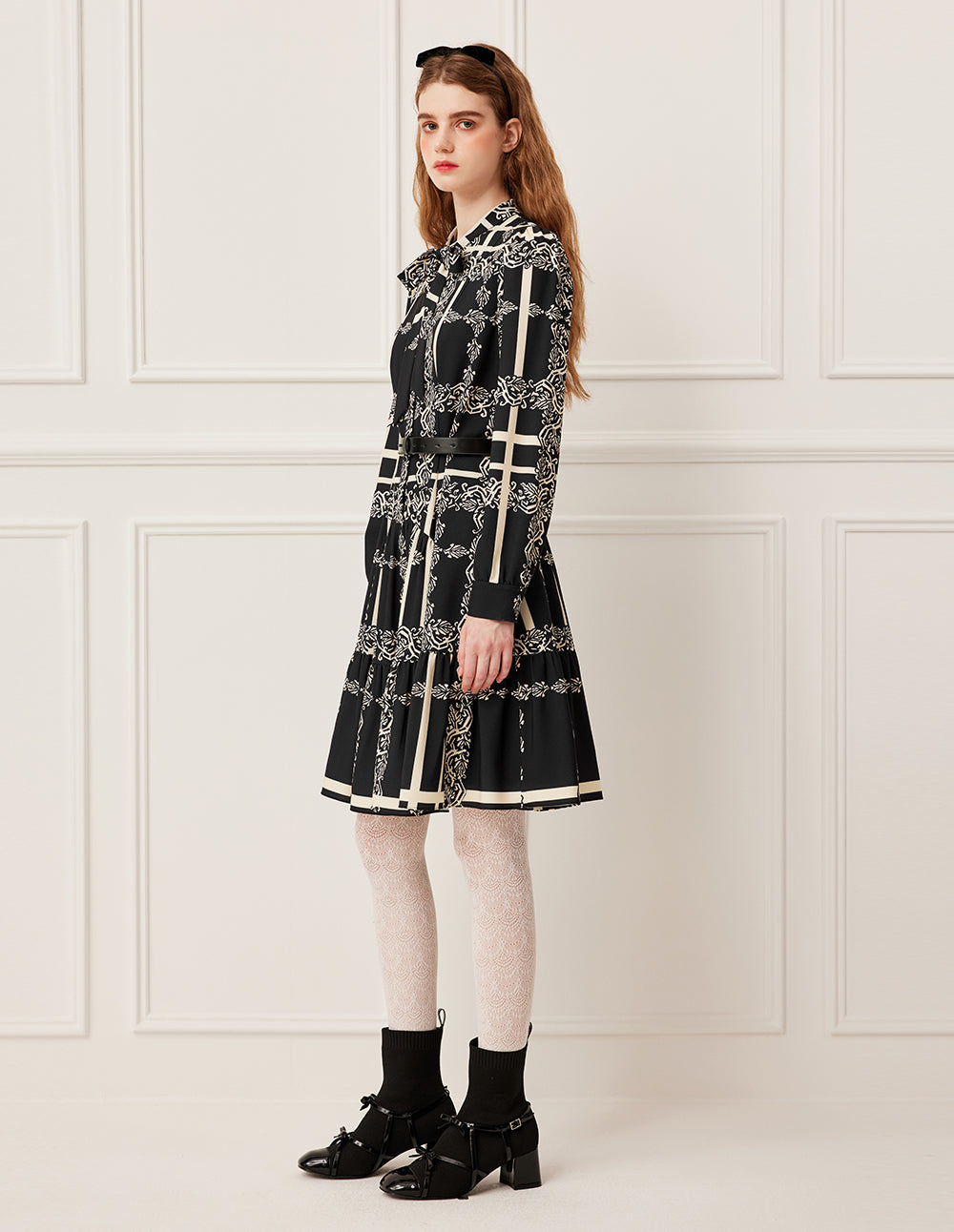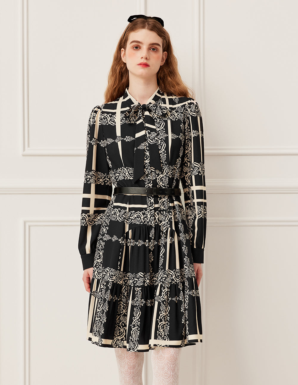 This dress features a black base, with an apricot vine print that sways like winding branches under the moonlight, creating a romantic French ambiance. The stand-up collar and flowing ties can be tied into a bow for a feminine touch. A matching leather belt at the waist effortlessly defines the waistline. The dress is meticulously pleated, creating a light and flowing hem as you walk. The sheer fabric, combined with the inner slip, creates a perfect balance between a hazy aesthetic and practical wearability.