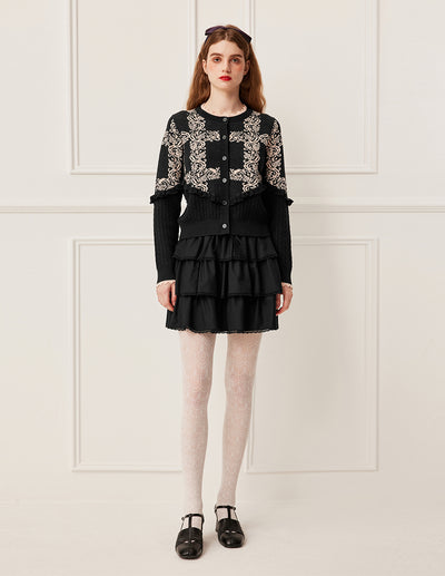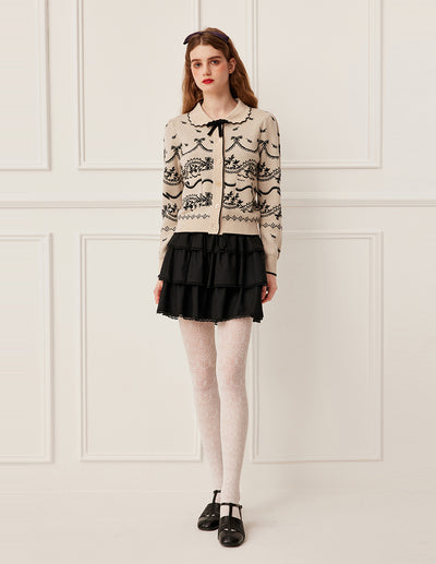 BORA AKSU Bow Tie Lapel Black Floral Pattern Long Sleeve Wool Cardigan