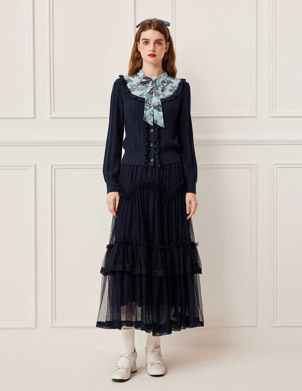 BORA AKSU Ruffled Peter Pan Collar Star Pattern Jacquard Long Sleeve Knit Cardigan