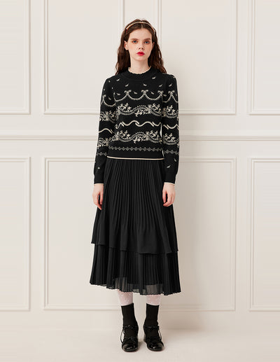 BORA AKSU Ruffled Round Neck Floral Print Wool Long Sleeve Sweater