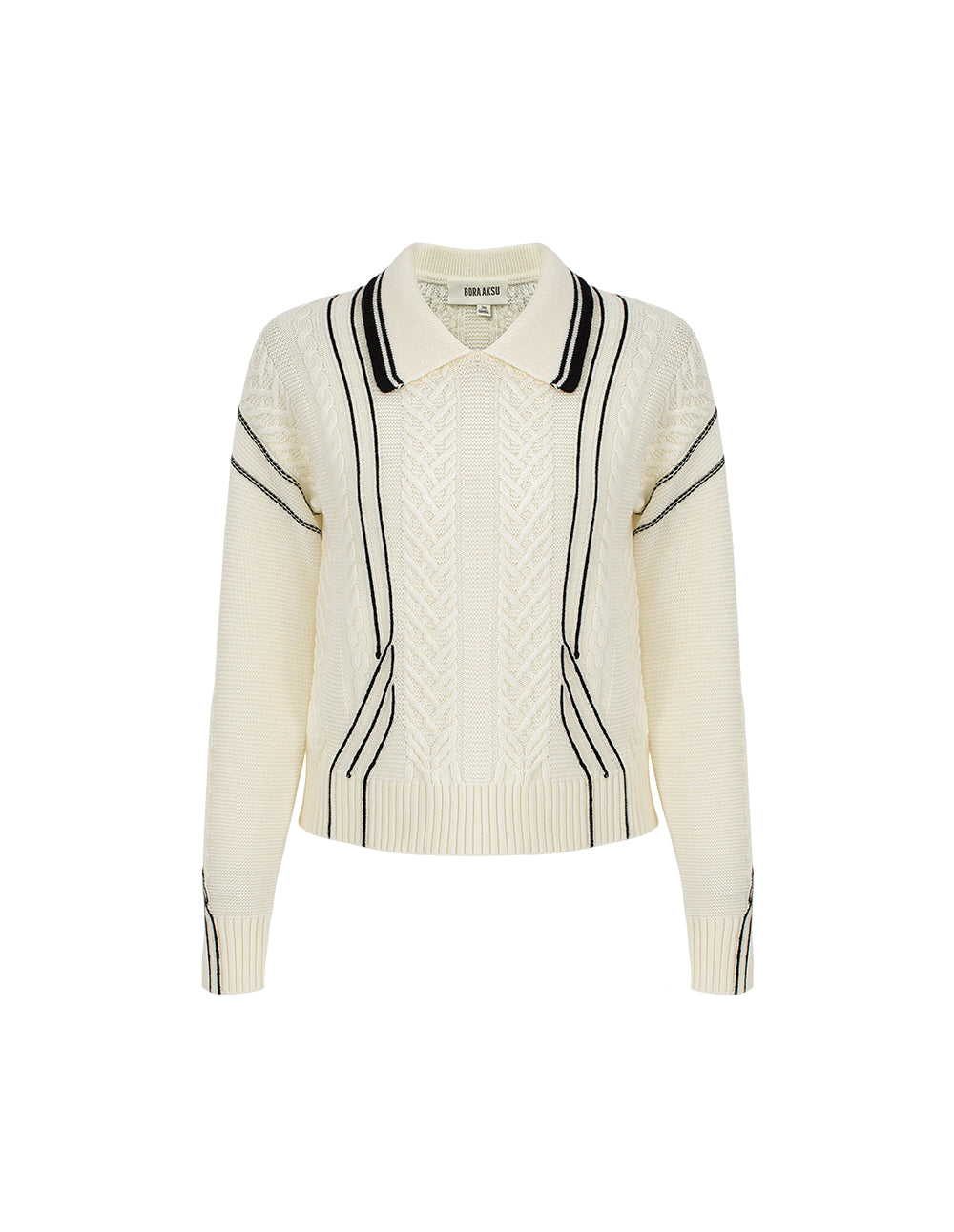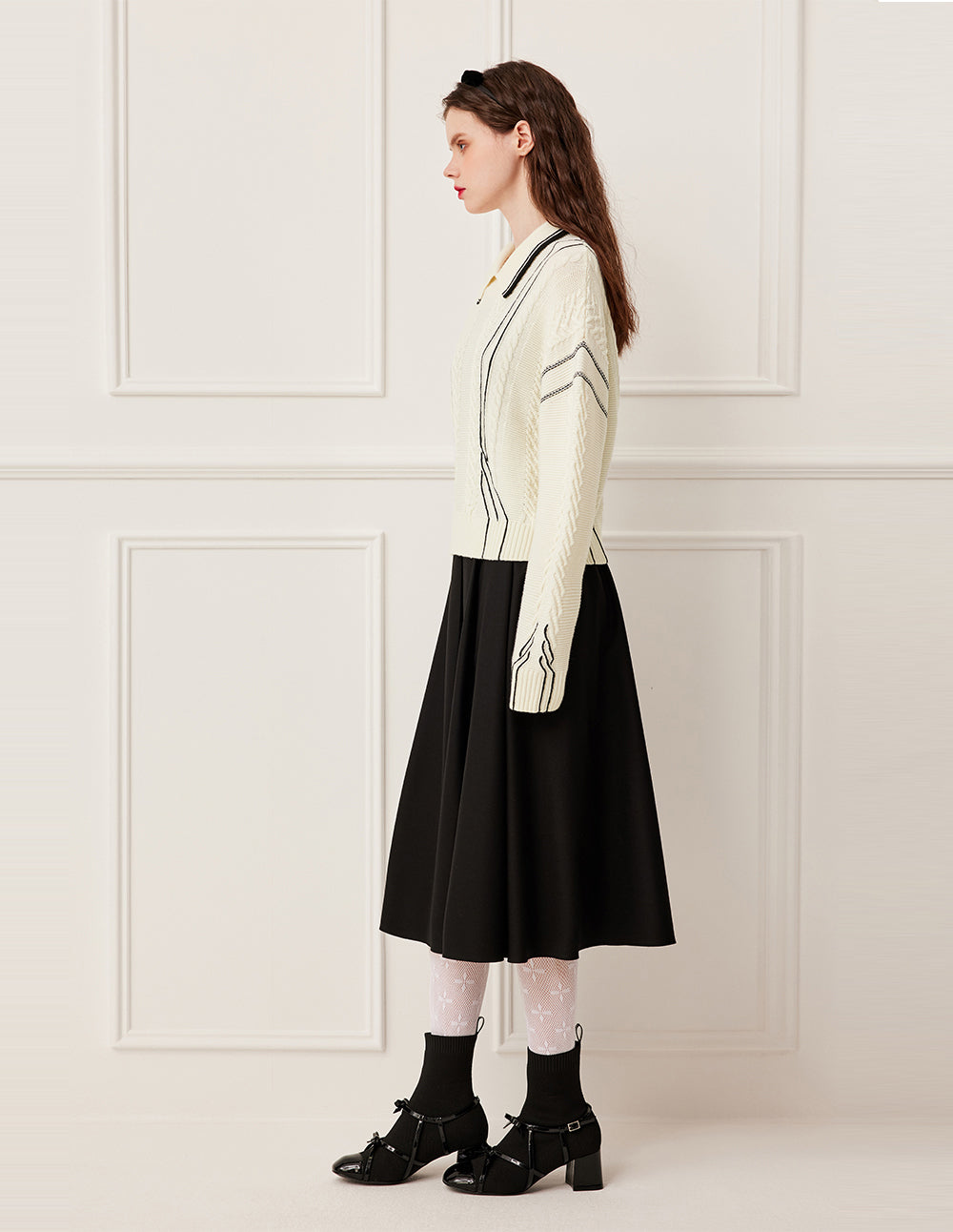 This autumn/winter wool knit features a poetic aesthetic, outlined in classic black and white stripes. The lapel design echoes the pinstripe extending across the shoulders, evoking a scholarly British aesthetic. The pure white base highlights the three-dimensional texture of the cable knit pattern, resembling the traces of sun-kissed snow. The gently cinched ribbed hem adds a touch of sophistication to the relaxed, preppy look. Whether paired with a plaid skirt for a retro vibe or jeans for a casual look, this piece imbues every moment with a romantic, scholarly air.