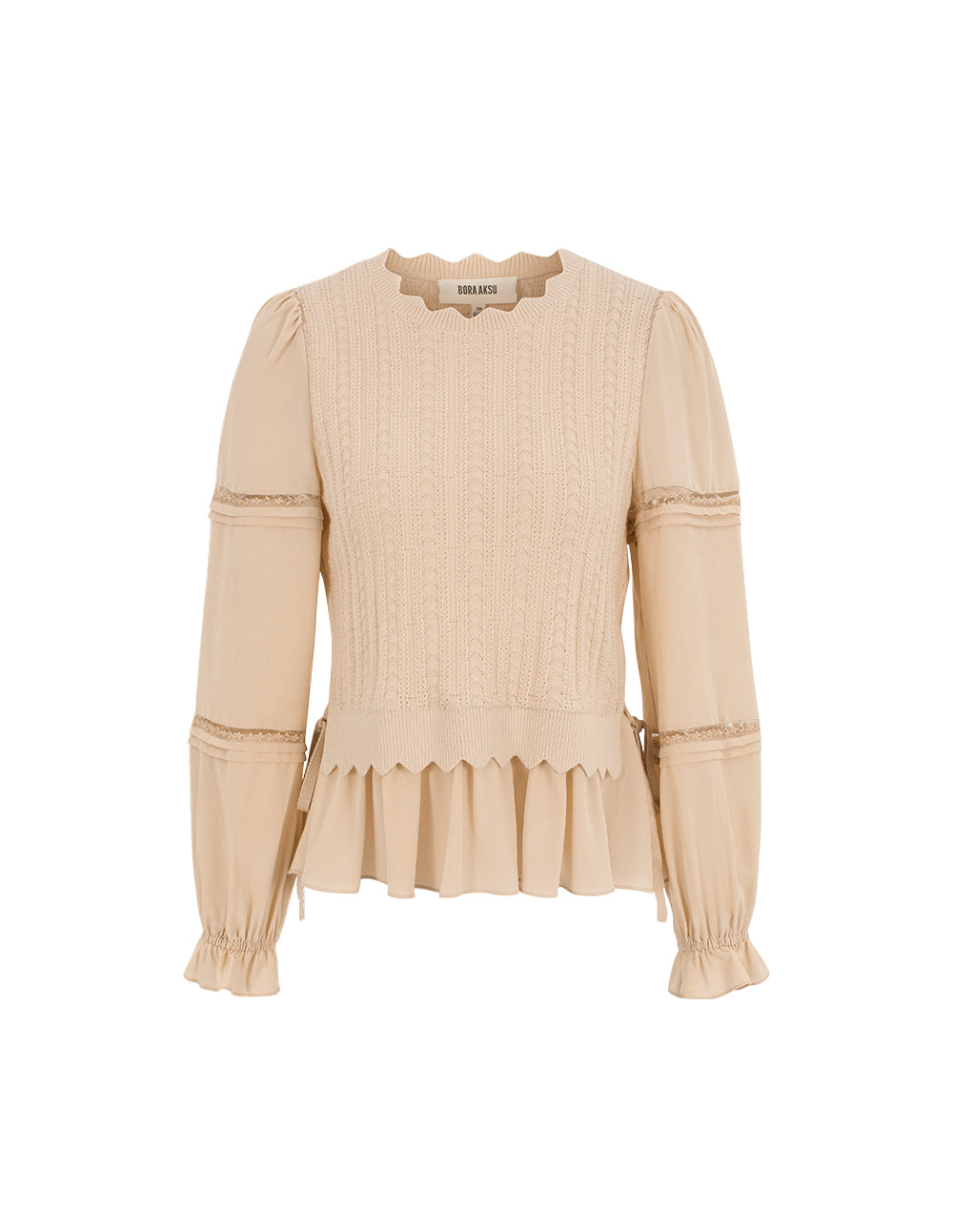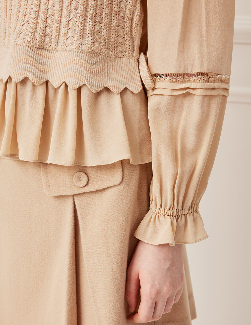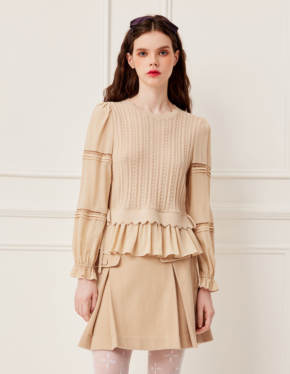 The gentle beige-apricot color is perfectly executed. The wavy edges of the round neckline bloom like petals, while the fluffy puff sleeves create a retro and romantic silhouette, and the lace cuffs add a delicate detail. Most strikingly, the hem is stitched with mulberry silk tulle. Its light and flowing texture creates a subtle contrast with the warmth of sheep wool, retaining the comfort of knitwear while adding a hazy, almost elusive aesthetic.