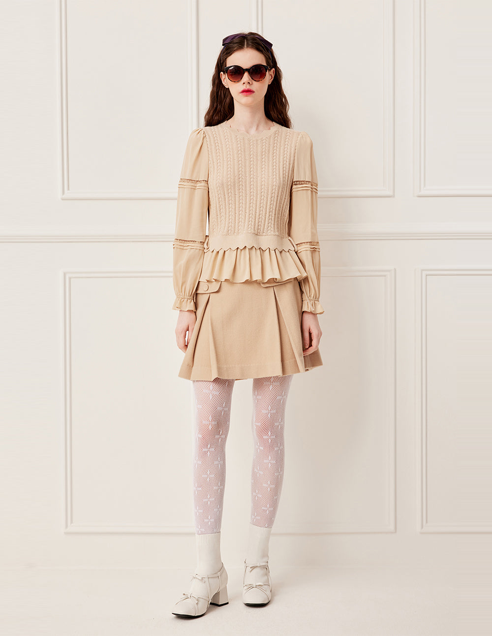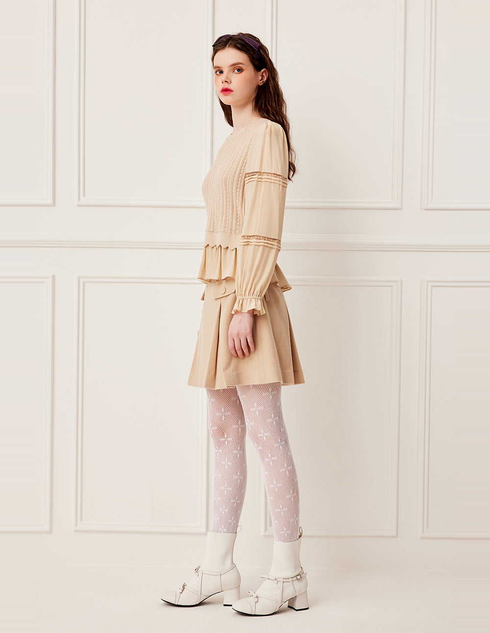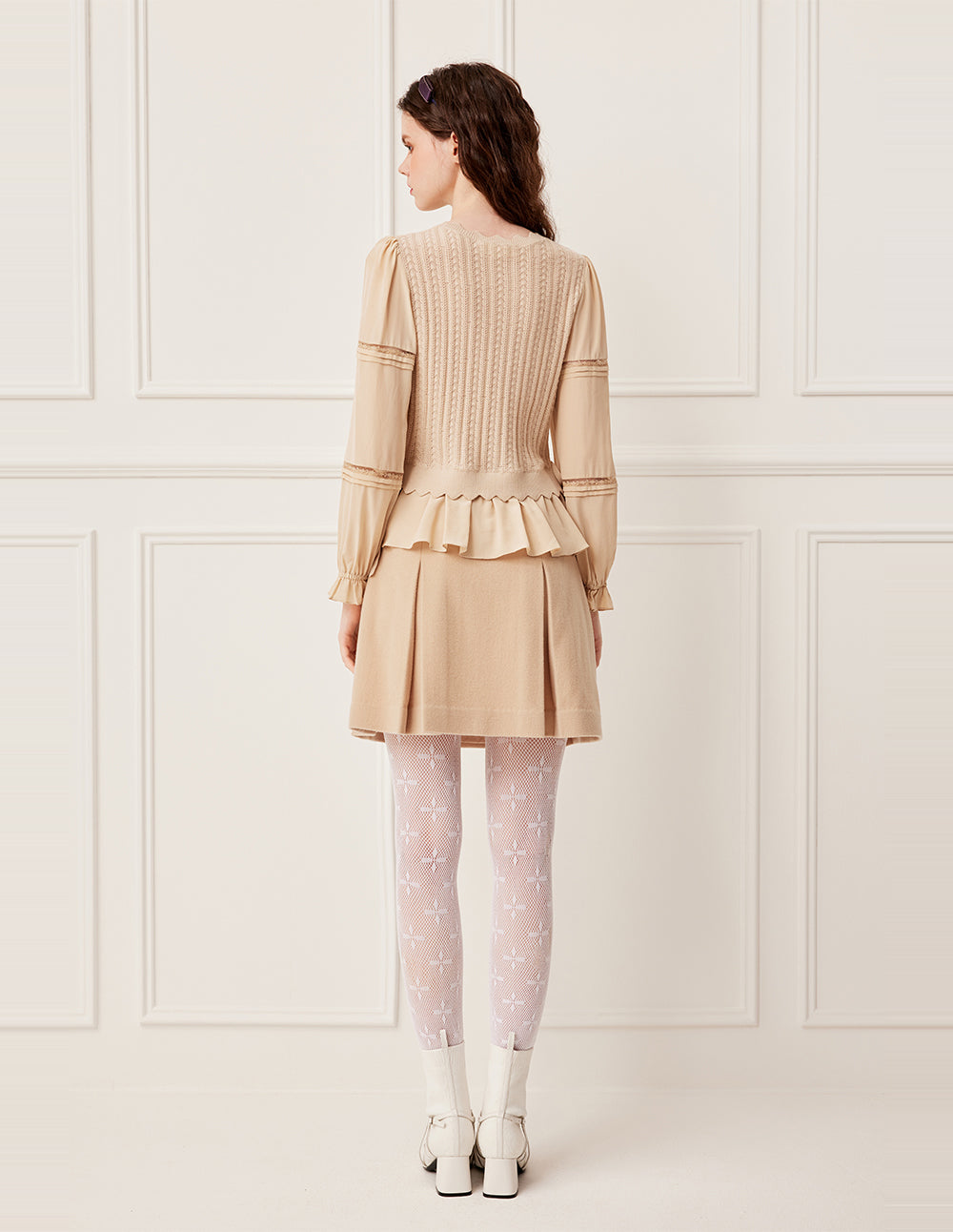 The gentle beige-apricot color is perfectly executed. The wavy edges of the round neckline bloom like petals, while the fluffy puff sleeves create a retro and romantic silhouette, and the lace cuffs add a delicate detail. Most strikingly, the hem is stitched with mulberry silk tulle. Its light and flowing texture creates a subtle contrast with the warmth of sheep wool, retaining the comfort of knitwear while adding a hazy, almost elusive aesthetic.