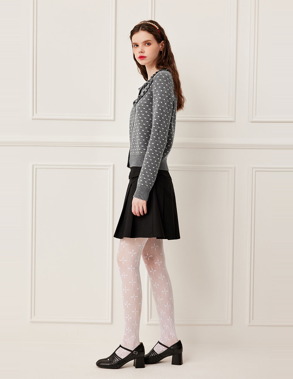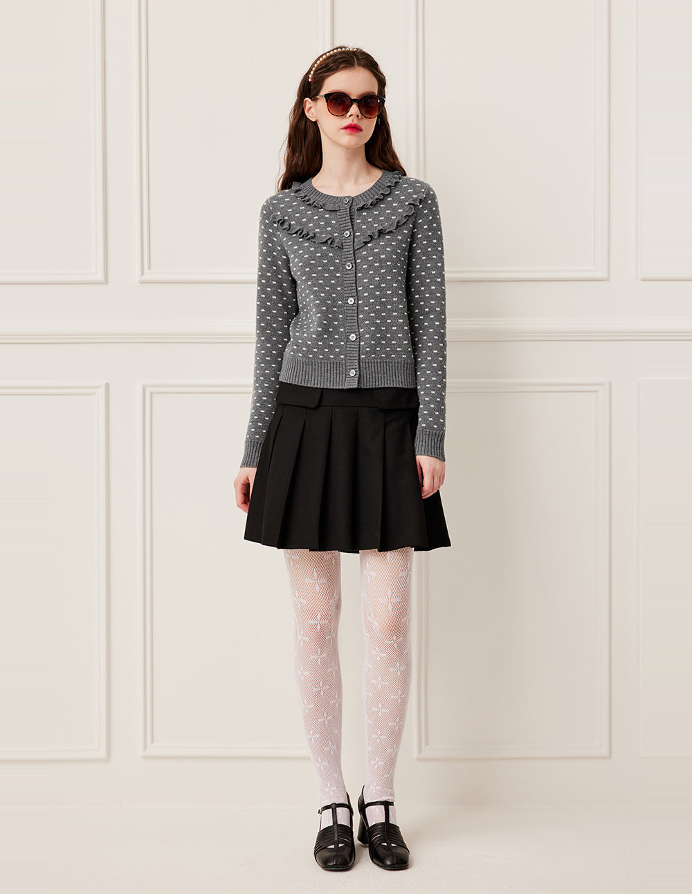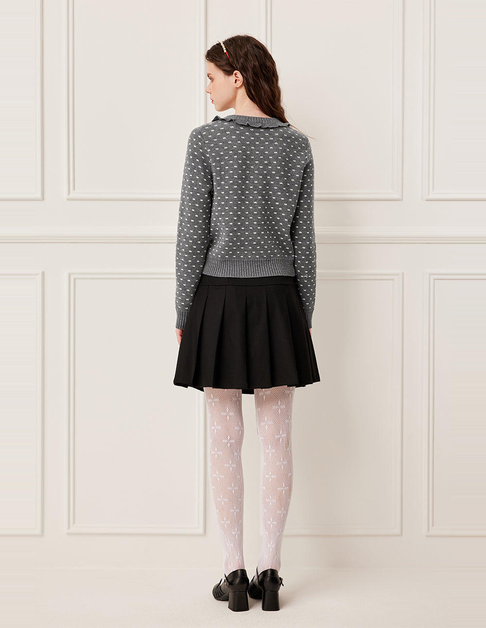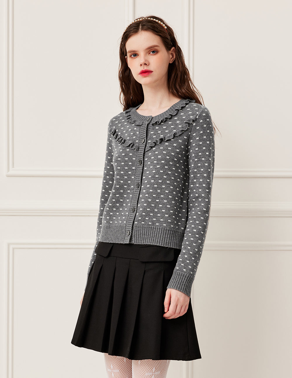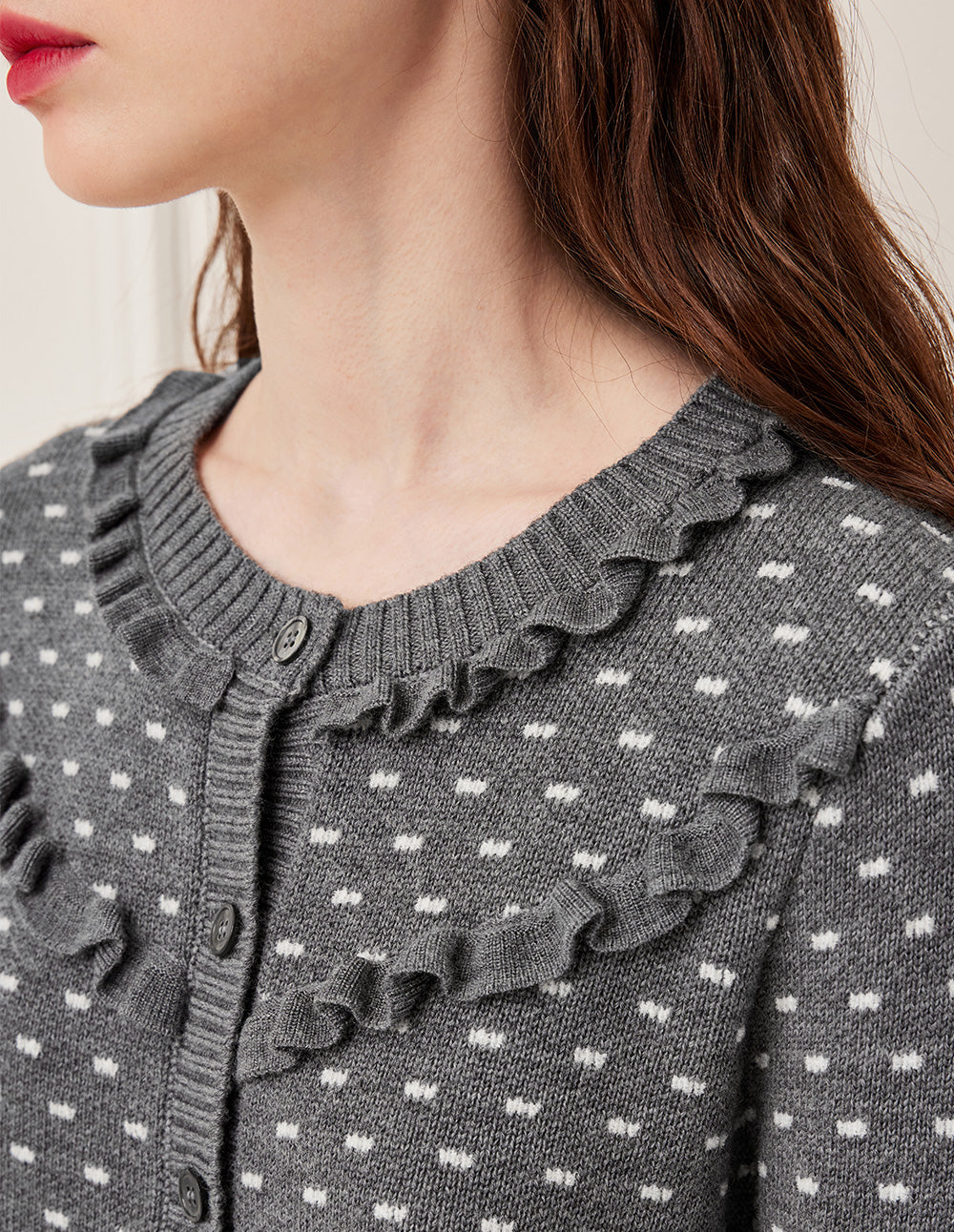 With a rich grey canvas, embellished with star-like white details, it feels like wearing the Milky Way. This French-style sheep wool knit jacket, with a small lapel and double-layered 3D ruffle trim, creates a layered and romantic look, enhancing both youthfulness and elegance. Made from premium sheep wool, it's soft and skin-friendly, providing warmth without bulk. Whether paired with a skirt or pants, it creates a relaxed and sophisticated look.