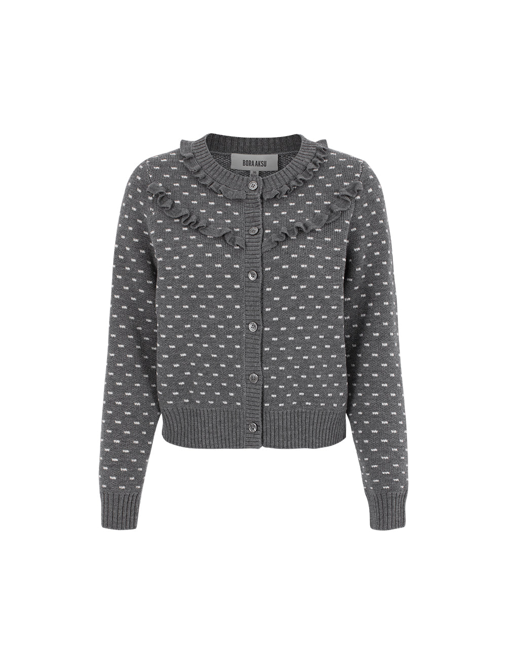 BORA AKSU Round Neck Long Sleeve Wool Knit Cardigan with Ruffle Trim