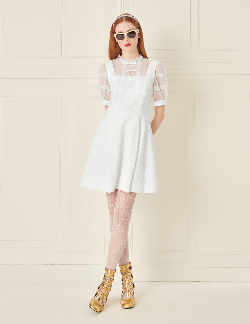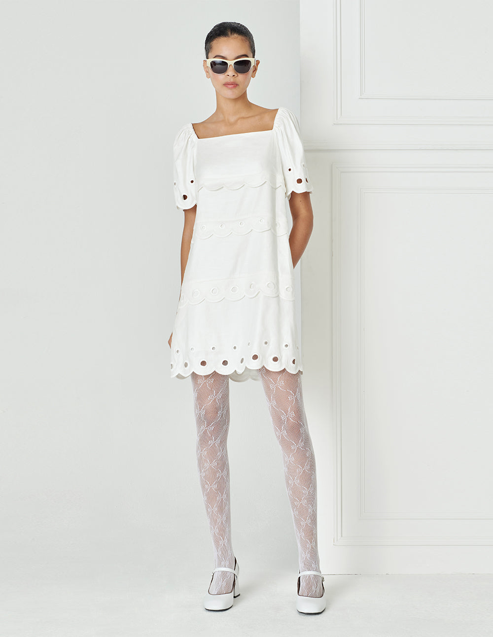 BORA AKSU Round Neck Puff Short-Sleeve Hollow Lace Trim Pleated Midi Dress