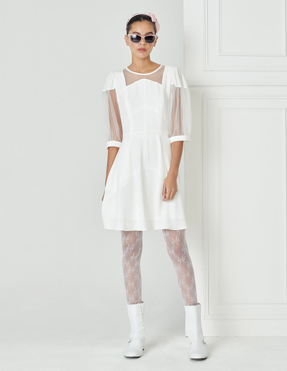 BORA AKSU Puff Sleeve Lace Patchwork Pleated Dress