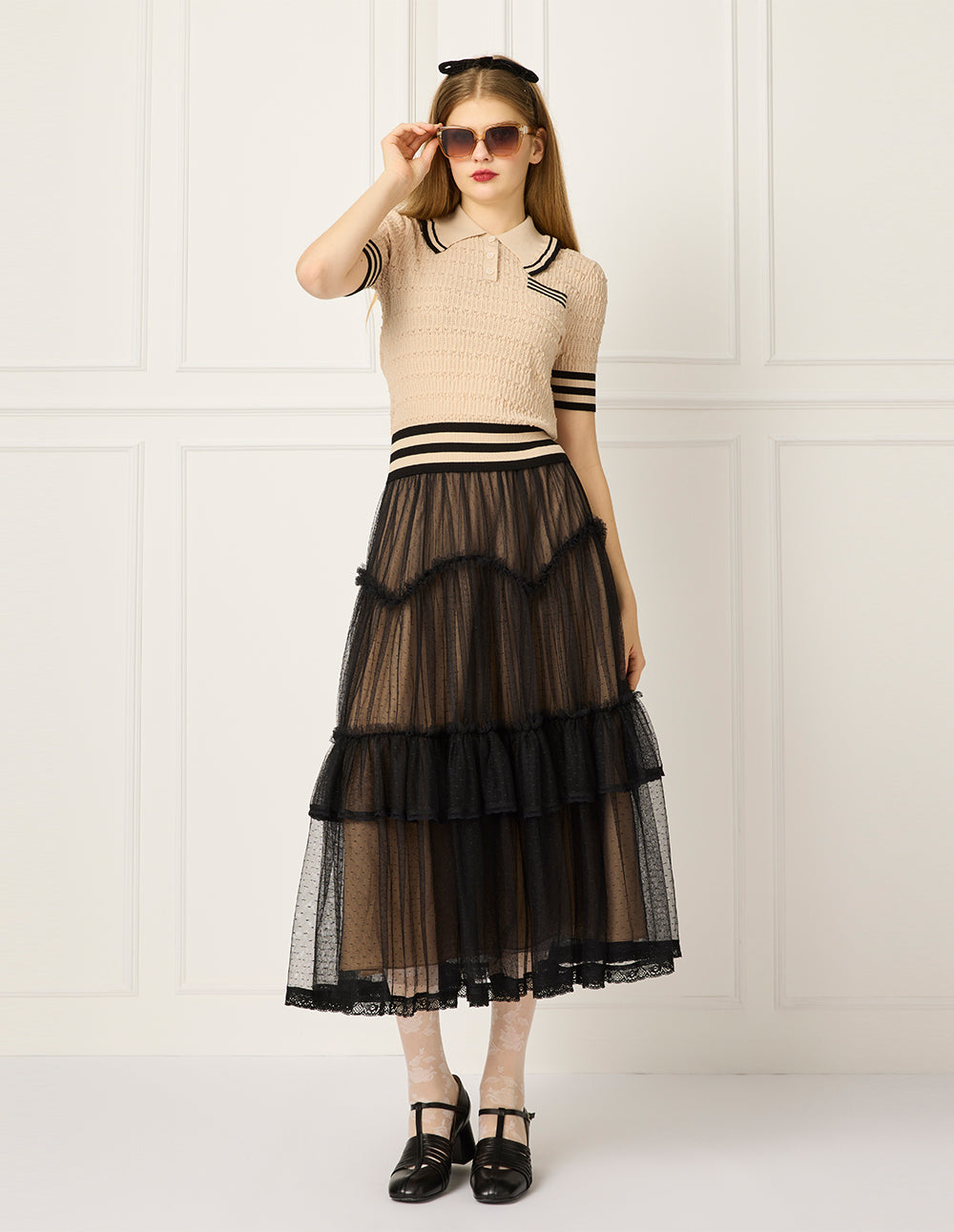 This lapel pullover incorporates delicate pleats and hollow textures, making it rich in layers, gentle and elegant. The wavy edges are intertwined with black contrasting details to outline smooth lines and give the whole body a dynamic rhythm, showing a harmonious balance between softness and sophistication.
