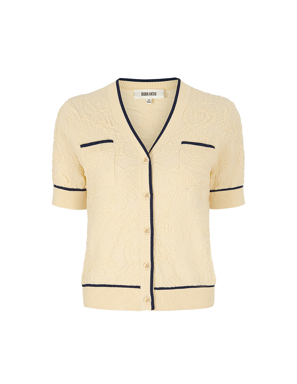 BORA AKSU V-Neck Short-Sleeve Striped-Trim Floral Embroidered Knit Cardigan