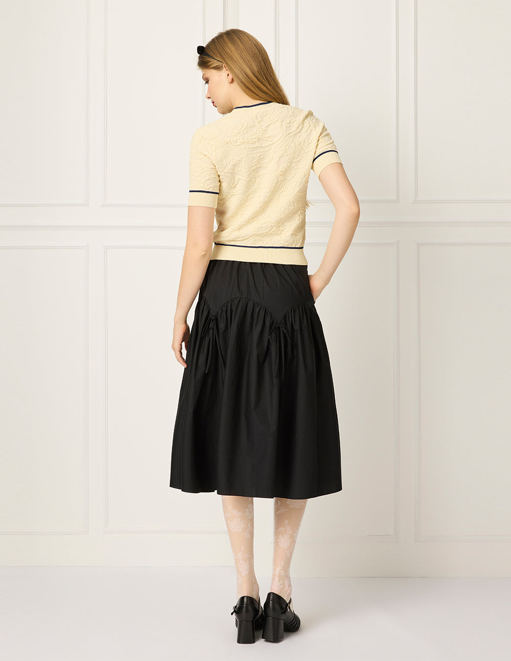 This knitted cardigan is made with an embossed vine-entwining texture. The rich material texture and jumping color-matching design increase the design and layering of the clothing. The geometric contrasting colors are fluttering on the hem; from the morning meeting room to the dusk cafe, the light and shadow flow is filled with modern and light luxury aesthetics.