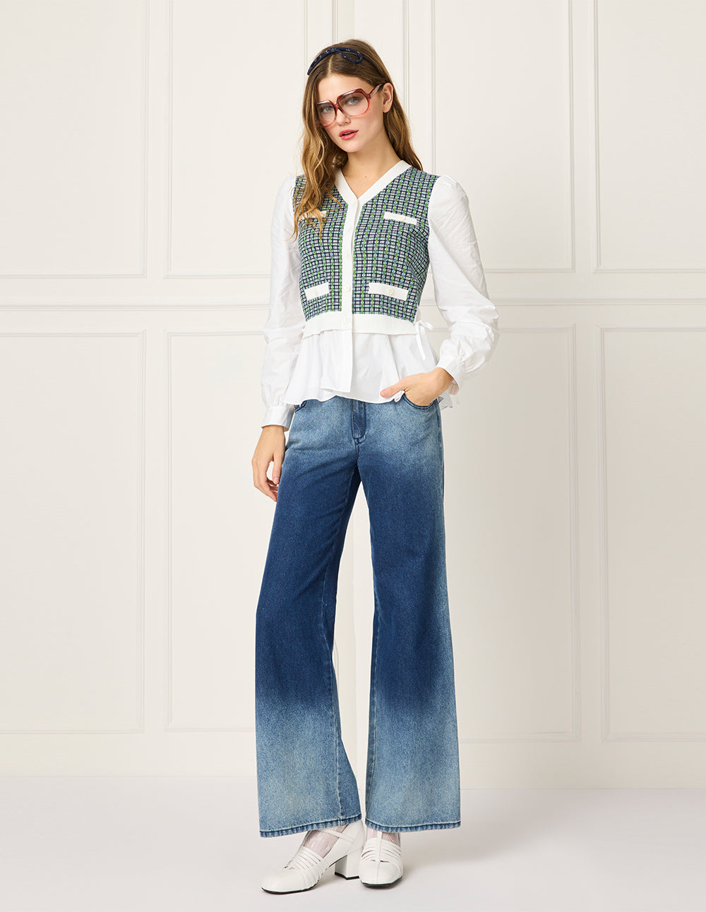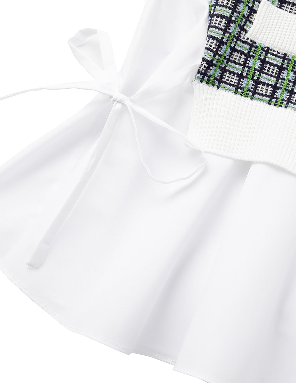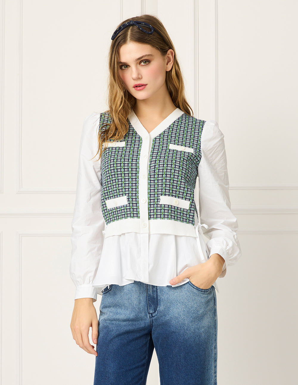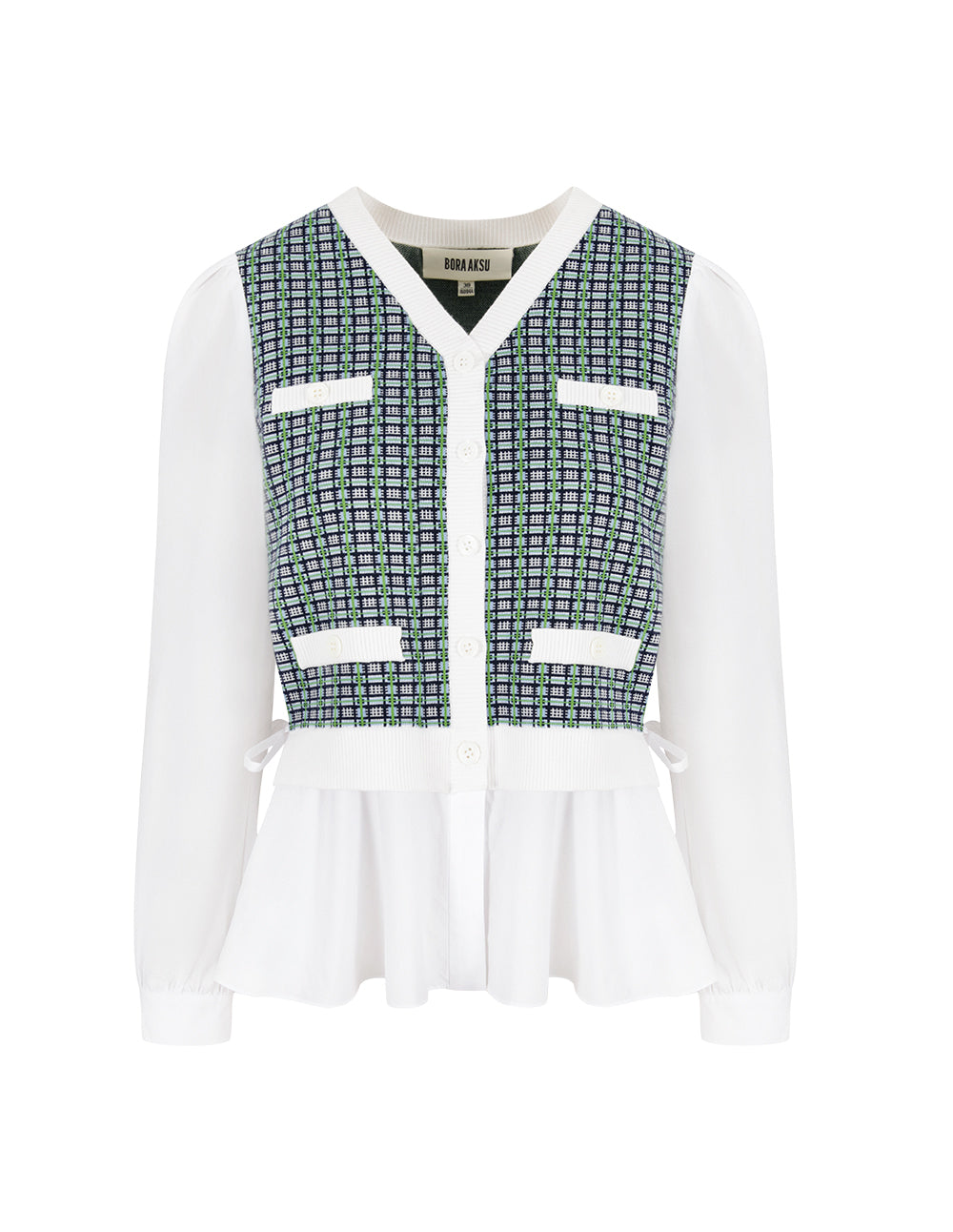 This knitted cardigan uses three-dimensional jacquard technology and a fake two-piece design. The navy blue, pink and green plaid collides with the Morandi color scheme to show its elegance. The cream and white contrasting webbing outlines geometric aesthetic lines. It is combined with the wavy lotus leaf hem and uses patented pleating shaping technology. It shows a retro artistic style when walking and easily creates an elegant commuting look.