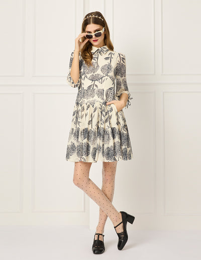 The apricot tulle base is like smoke and fog, and the black ink dahlias spreading on the skirt are blooming freely, creating an artistic conception. The retro lapel and mid-length sleeves outline a sweet temperament, and the cuffs are lightly tied with bows, which are smart details. The A-line umbrella hem is spread out with pleats, and every step seems to be swaying with the wind and dew.