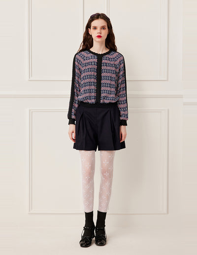 Inspired by the fusion of abstract art and natural waves, this light black base is embellished with a vibrant red and white circular geometric print, evoking the illusion of modern art worn on the body. The black knitted wavy hem is delicate, soft, and stretchy, creating a subtle contrast with the silk base. The overall design is both soft and structured, with the silk imparting a light, lustrous sheen and a skin-friendly feel, while the knitted wavy hem adds a romantic detail.