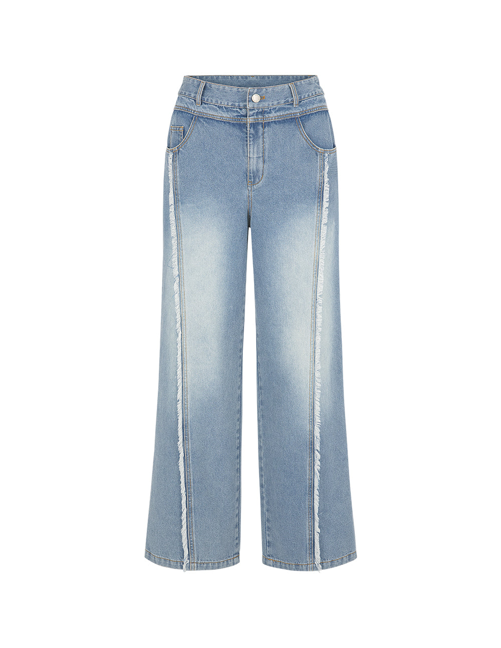 This pair of jeans has a smooth cut and is neat and stylish. The meticulous fringe washing process presents a rich visual effect to the smooth patchwork lines. The frosted white washing details bring a dynamic variation. They are a classic choice worth keeping in your daily casual wardrobe.