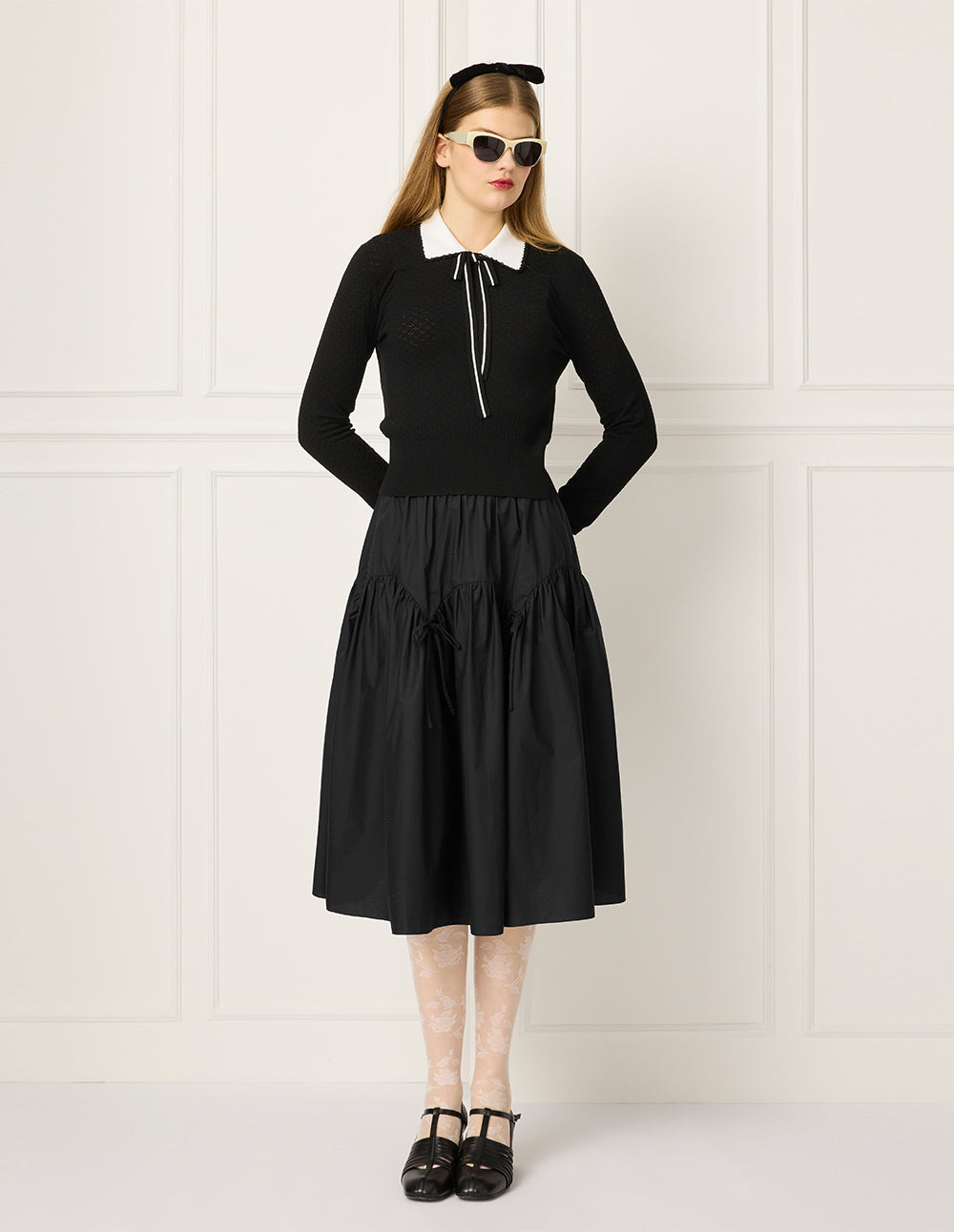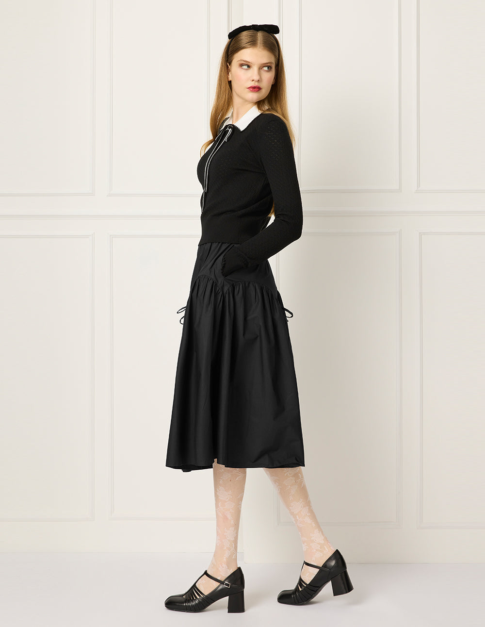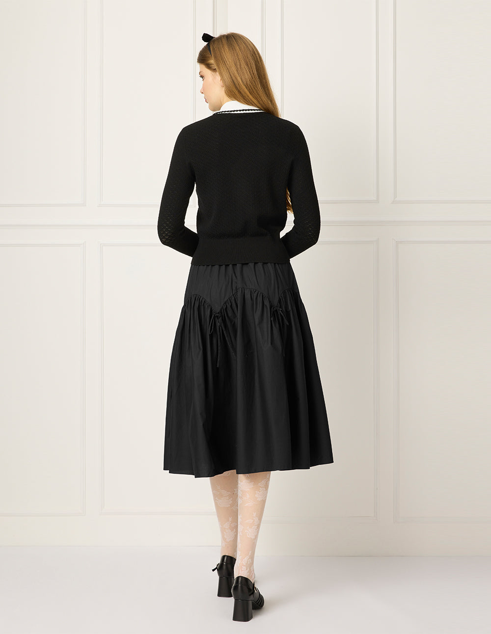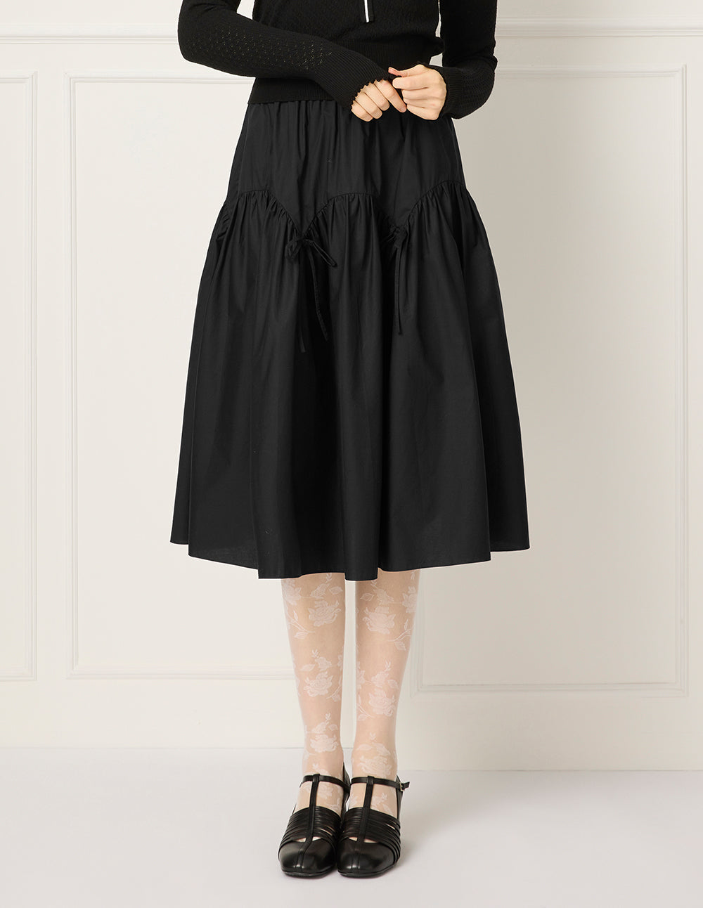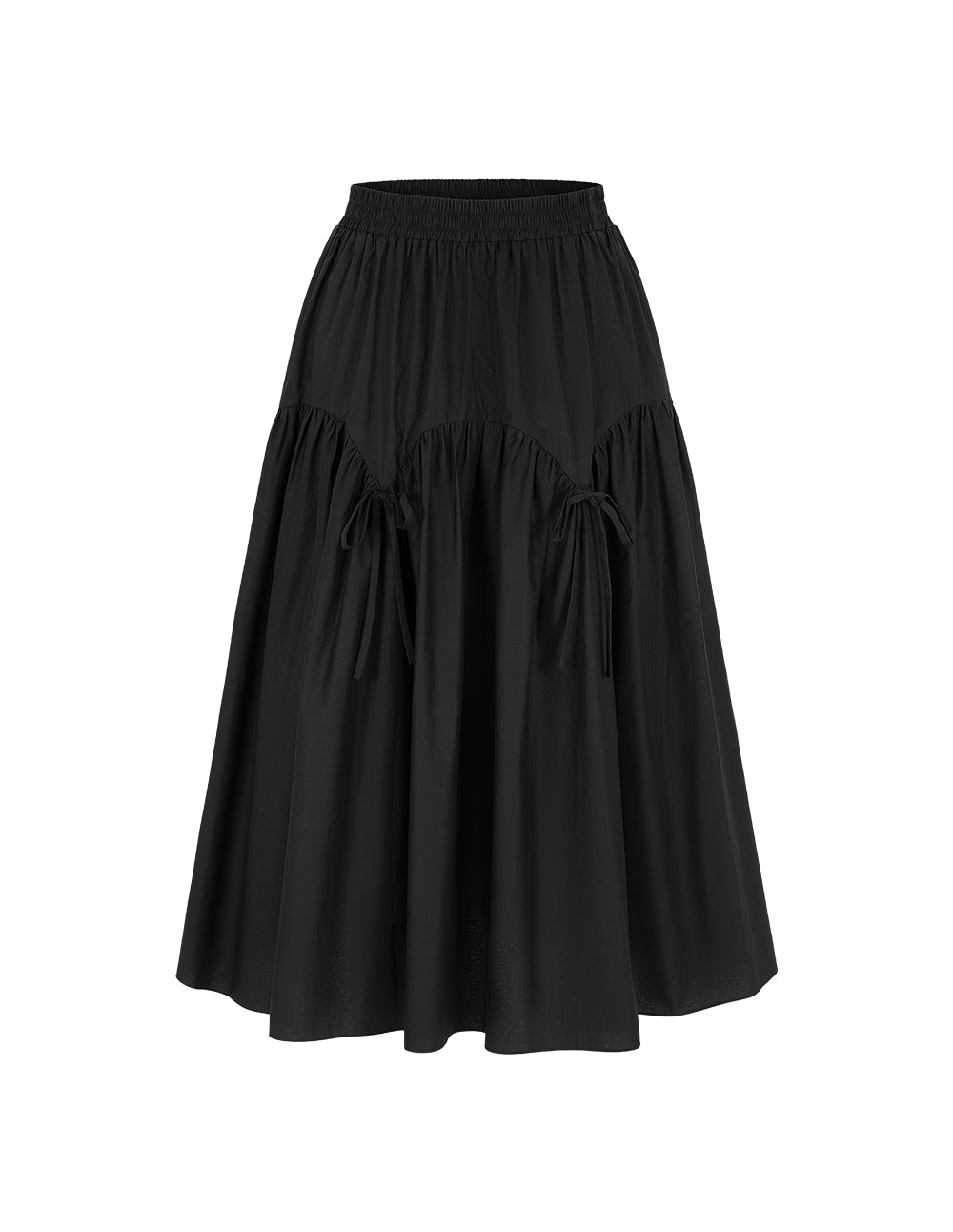 This skirt uses three-dimensional pleating technology to outline a simple and elegant silhouette, and is equipped with bow ribbons, giving it a romantic atmosphere. Whether paired with a knitted top or a variety of blouses, you can easily create a casual and fashionable look and show off your taste.