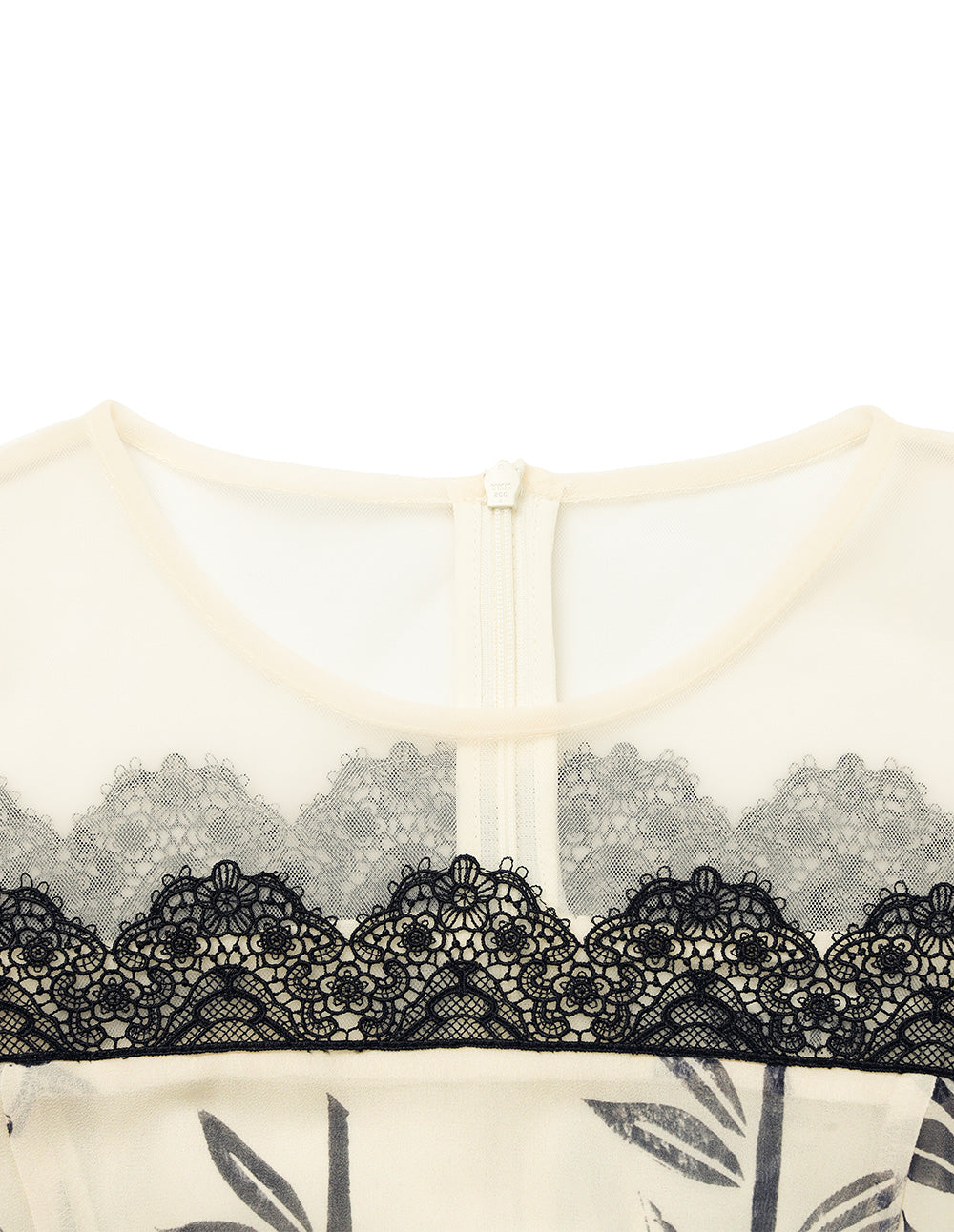 The hazy beauty of tulle is perfectly combined with the art of retro prints. The apricot base is as gentle as the morning light, and the black dahlias blooming on the chest and skirt are spreading freely, like a flowing painting of a dark garden. The transparent round neck and short sleeves are light and transparent, the black wavy edges outline the chest line and waist, and the contrasting stitching and bow tie on the cuffs add playful details.