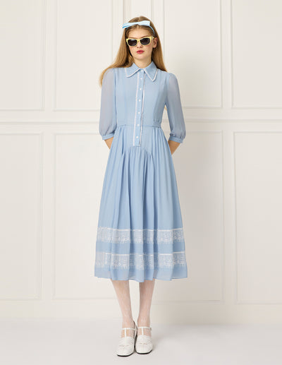 This shirt-cut dress has a lace-up waist to outline the graceful curves, and the lace dividing line gently rhymes in the morning breeze, fitting the elegant narrative of the office window and the garden bench.