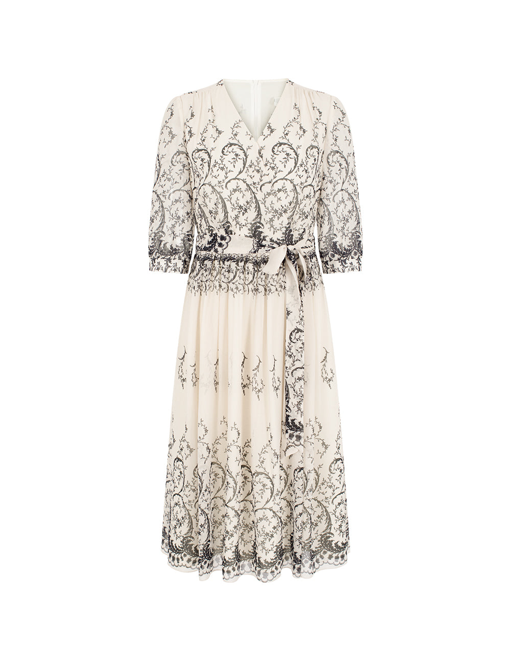The apricot base is like the warm light of a classical oil painting, and the black curly grass pattern spreads freely, just like the gorgeous carvings on the palace dome. The V-neck design extends the elegant neckline, and the wide belt can be adjusted at will to outline the slender waist. The A-line skirt is spread out with a vortex pattern, and it flows lightly like a dance step when walking.