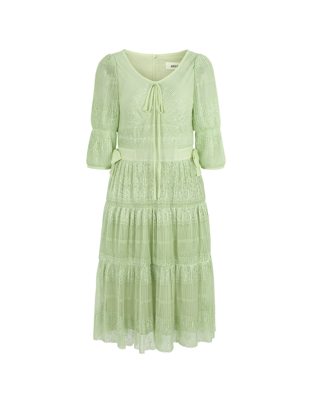 BORA AKSU V-Neck Puff Short Sleeve Tie Pleated Lace Midi Dress