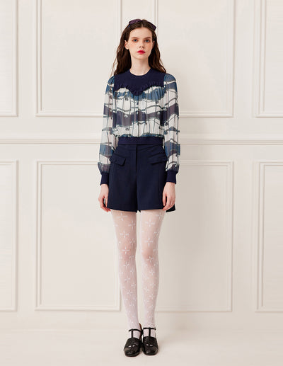 The navy blue background meets the blue and white checkered pattern, and the contrasting colors create a visual poem. The knitted fabric is as soft as a cloud, and the woven fabric has a lively luster, showing subtle changes in light and shadow between movement and stillness. The ribbed edge design is both retro and practical, perfectly outlining the neckline and cuff contours.