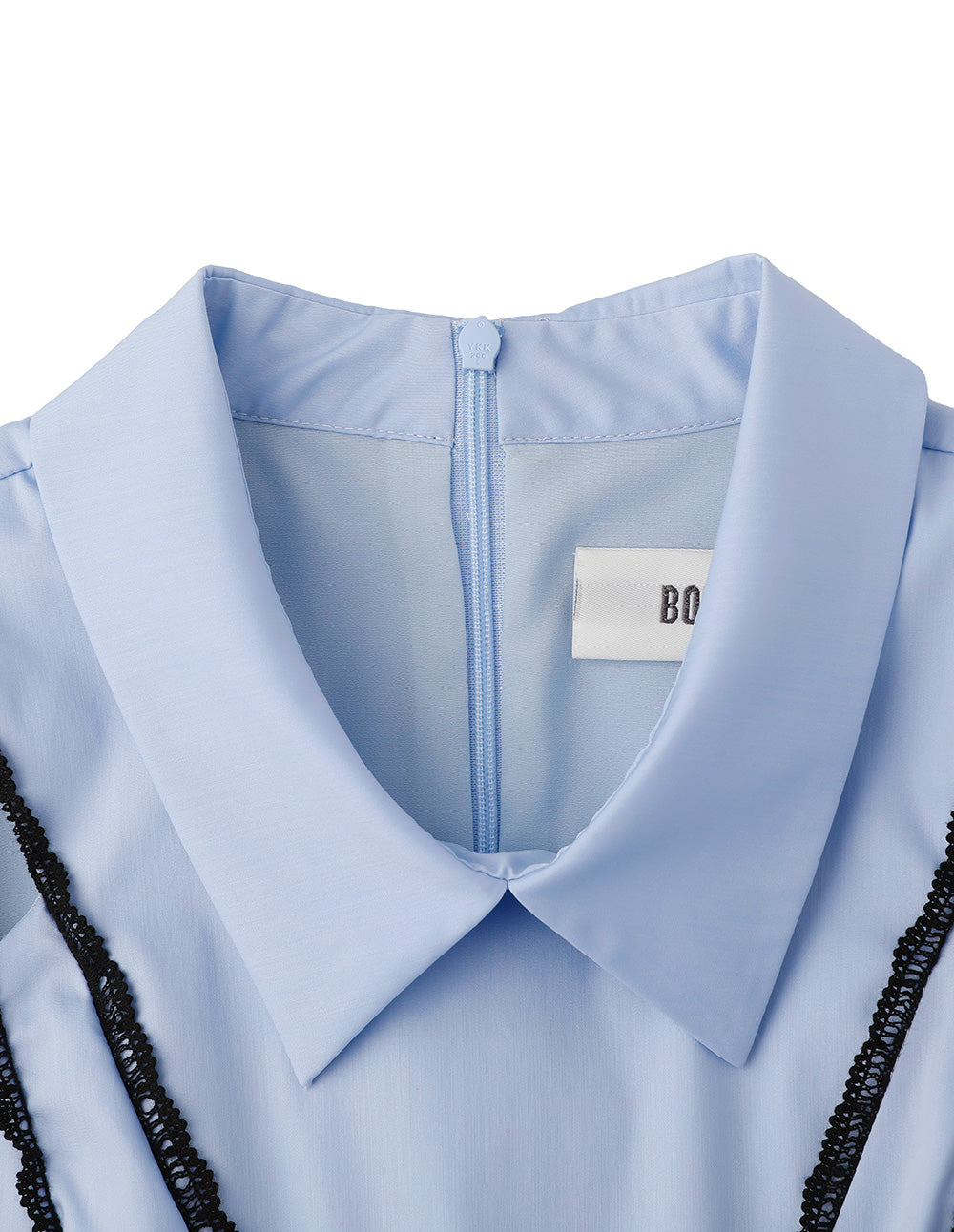 The dress is illuminated with exquisite color lace elements to create a rich visual effect, with a slightly transparent shoulder design adding a touch of elegance. The fusion of palace-style elements and modern sleek inspiration, together with a relaxed light blue base, allows for a leisurely roam in the city.