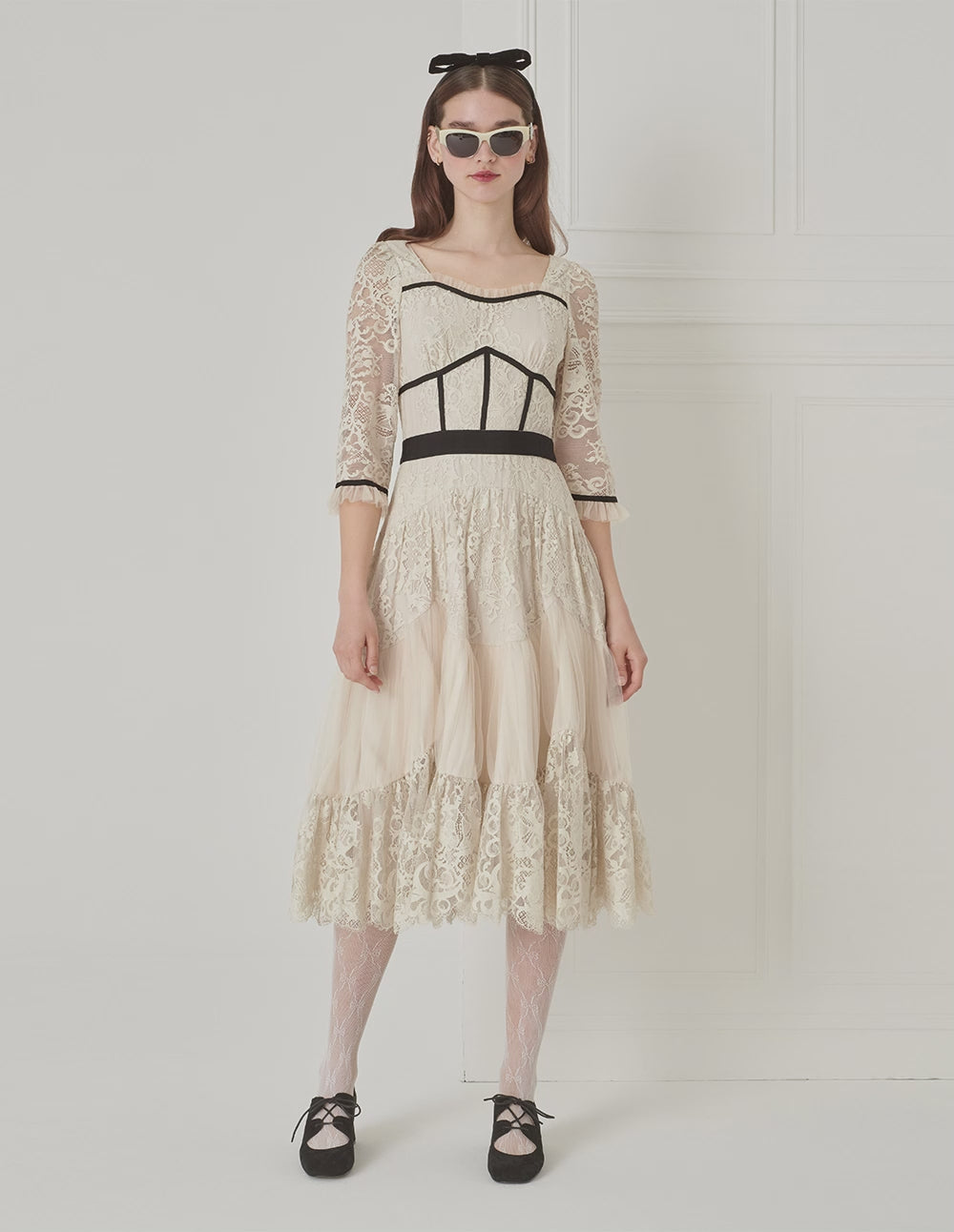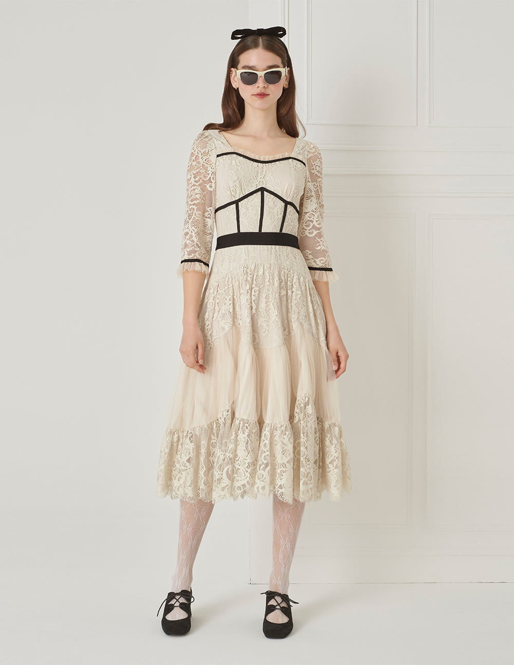 The dress is made of delicate lace fabric with pleated tulle, creating a richly layered visual effect. The color-blocked skirt design adds depth and dimension, while the clean, light apricot tone completes a refined French elegant look.
