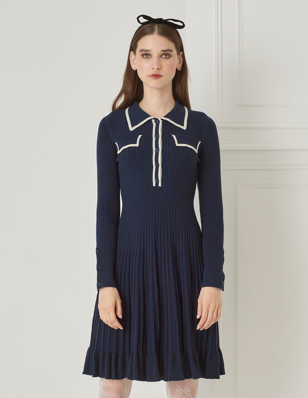 The knitted dress uses smooth lines to create a slim A-line silhouette. The contrasting blue and white hues are elegant and stylish, exuding a retro vibe with grace and romance. Paired with a wool coat, it is ready to ease into autumn.