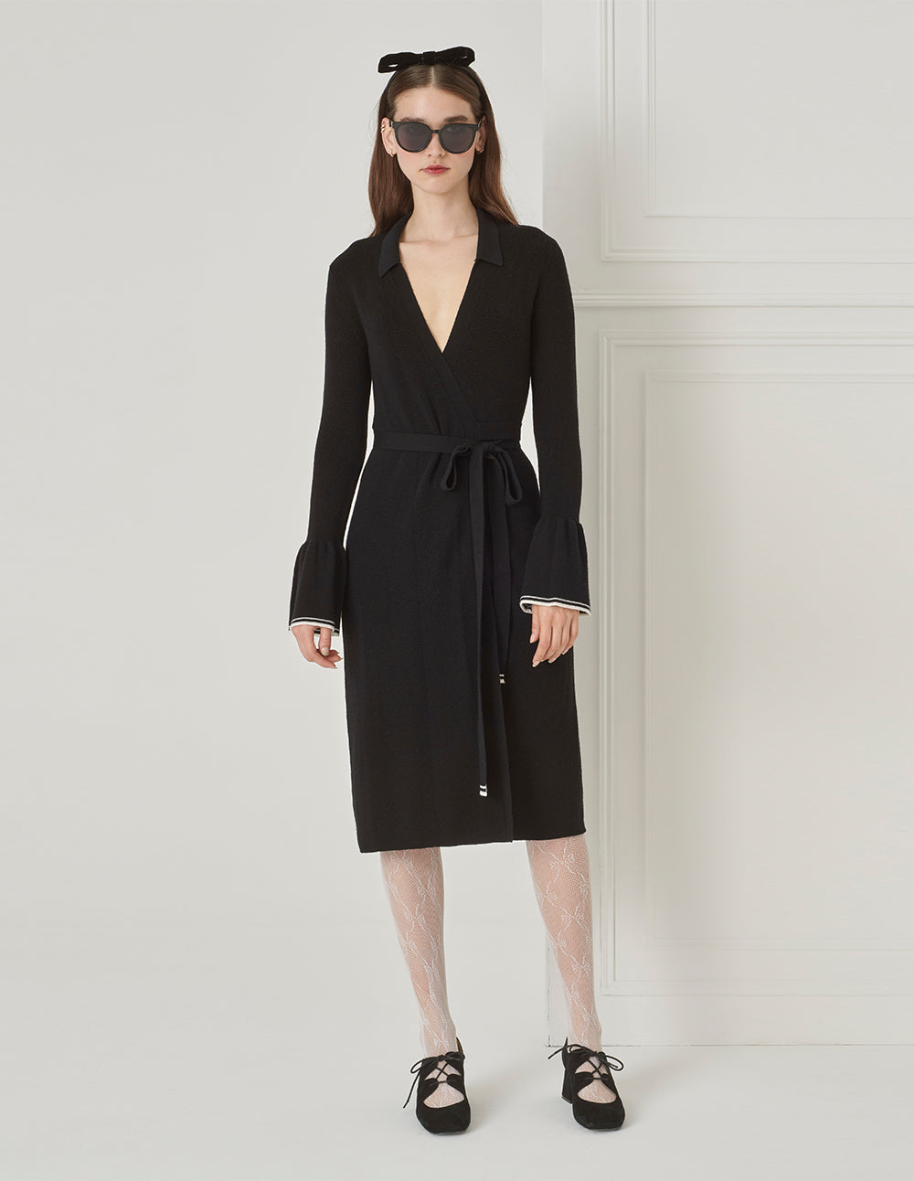 BORA AKSU V-Neck Pleated Hem Drawstring Waist Wool Knitted Dress