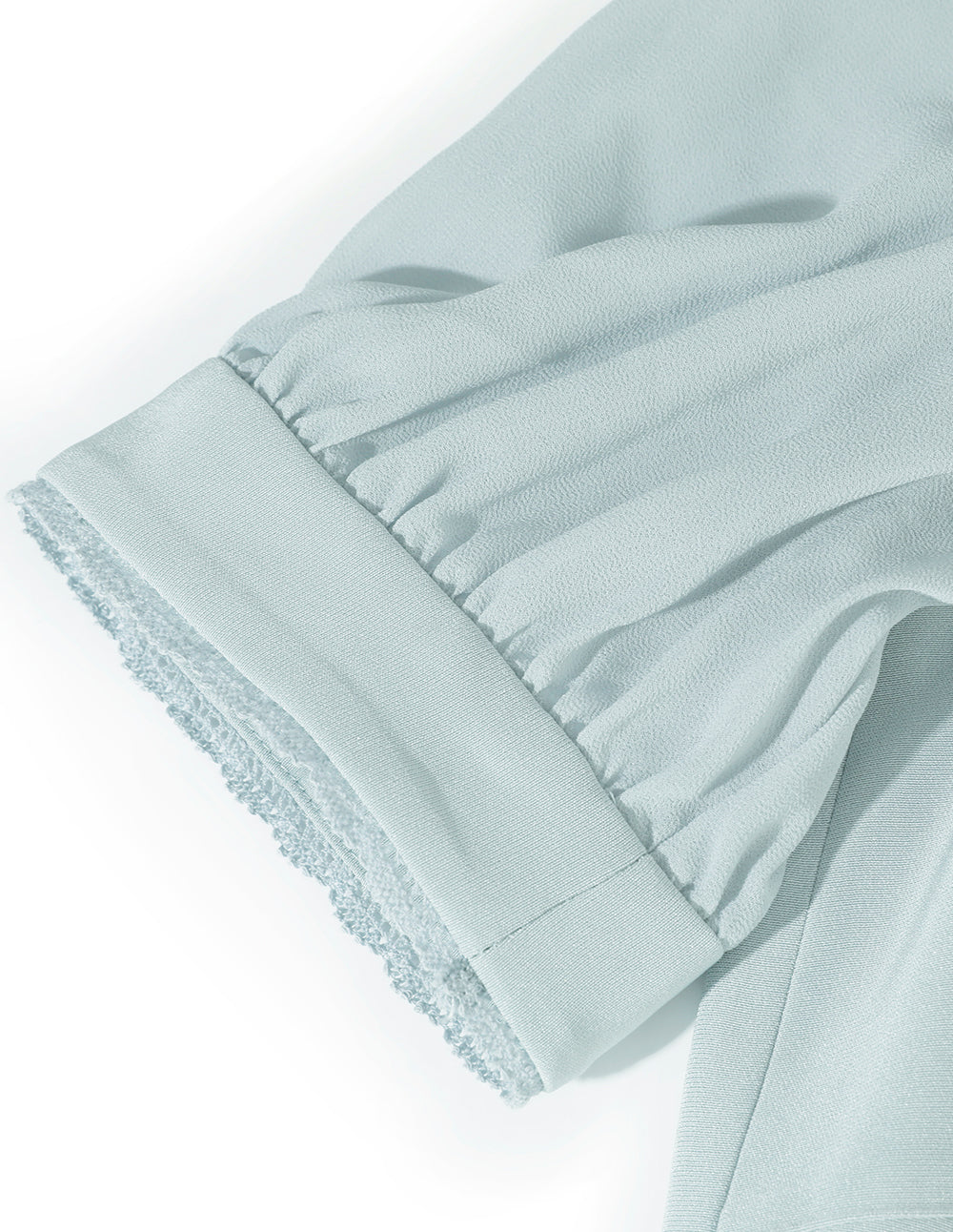 This V-neck dress is made from a solid, stretchy, and soft fabric. Delicate lace detailing at the neckline infuses softness, while the airy georgette sleeves bring a sense of dynamism, evoking a modernist aesthetic.