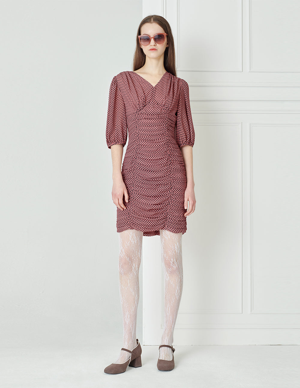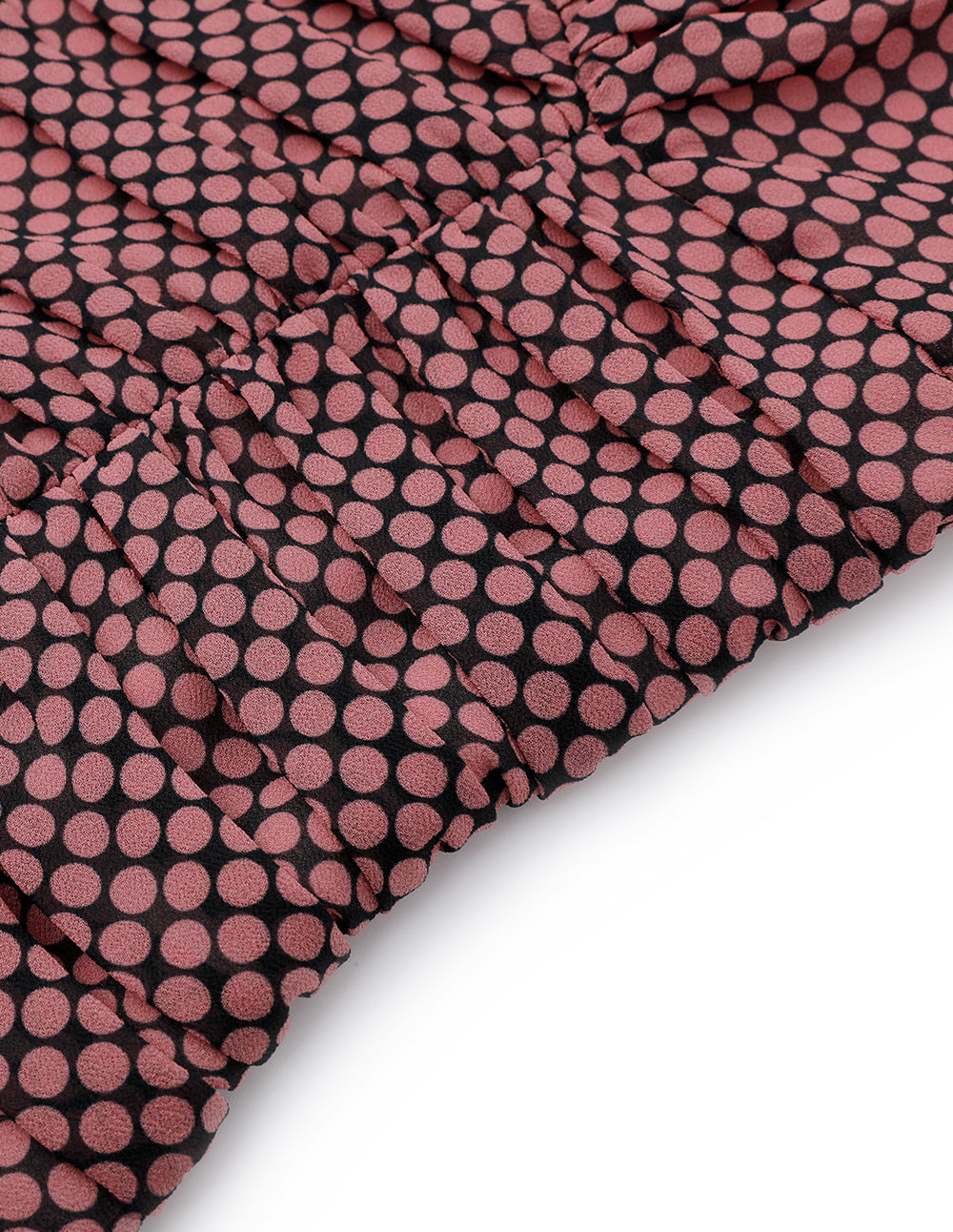 The designer integrated the retro polka dot elements of the 19th century into the single product. The black and pink color matching polka dots are evenly sized and carefully arranged, combined with elegant fabrics, pleats, and ruffle details, presenting a cheerful and vivid spring and summer new idea.