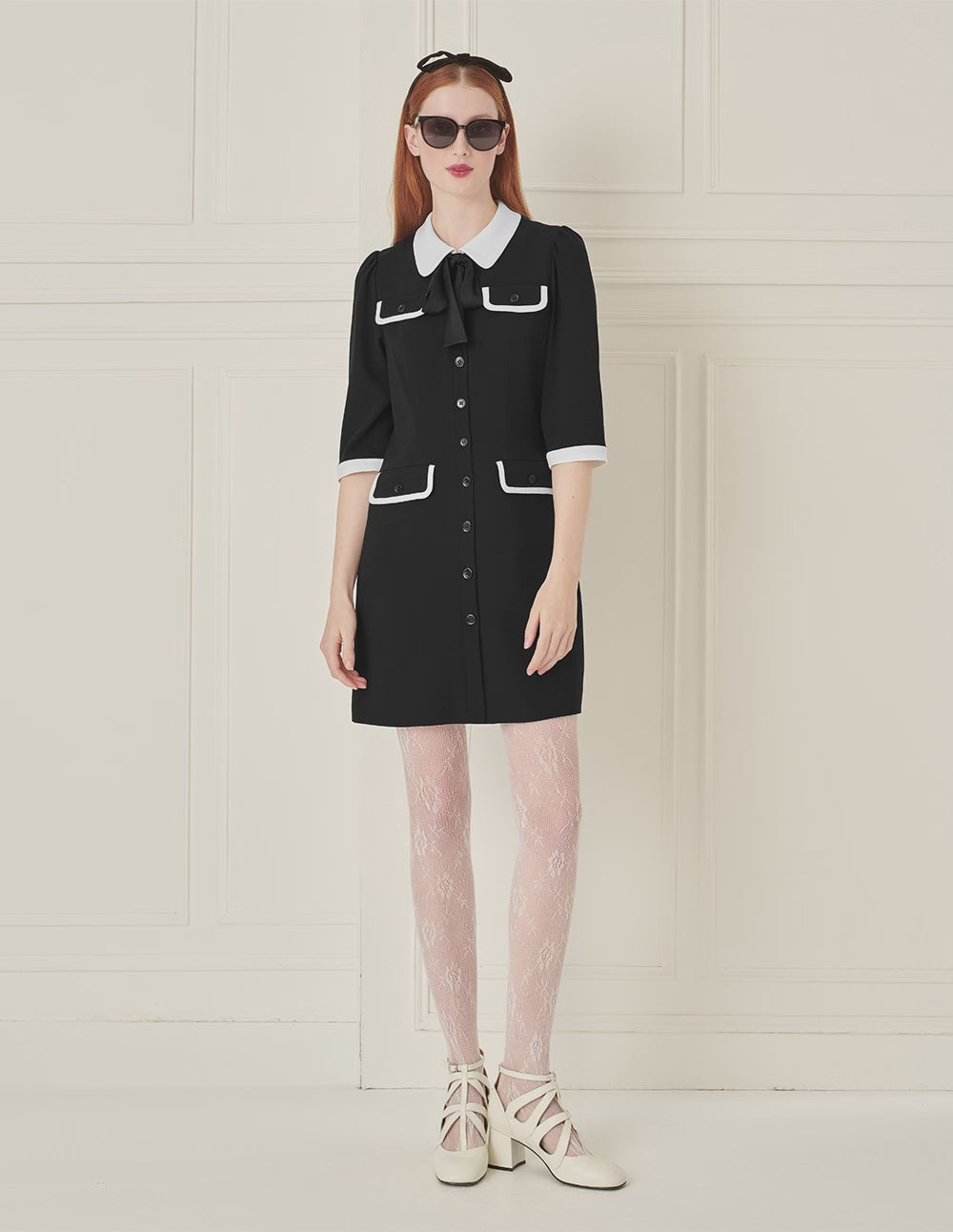 This dress is crafted with simple, elegant lines for a neat and flattering fit. The color-blocked collar design adds French sophistication, while the bow tie at the neckline introduces a touch of sweetness—creating a refined, everyday urban style.