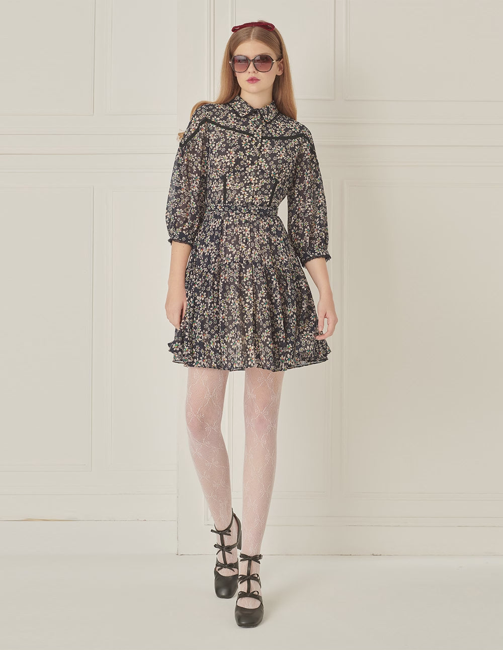BORA AKSU Puff Sleeves And Small Lace Waist And Pleated Floral Dress