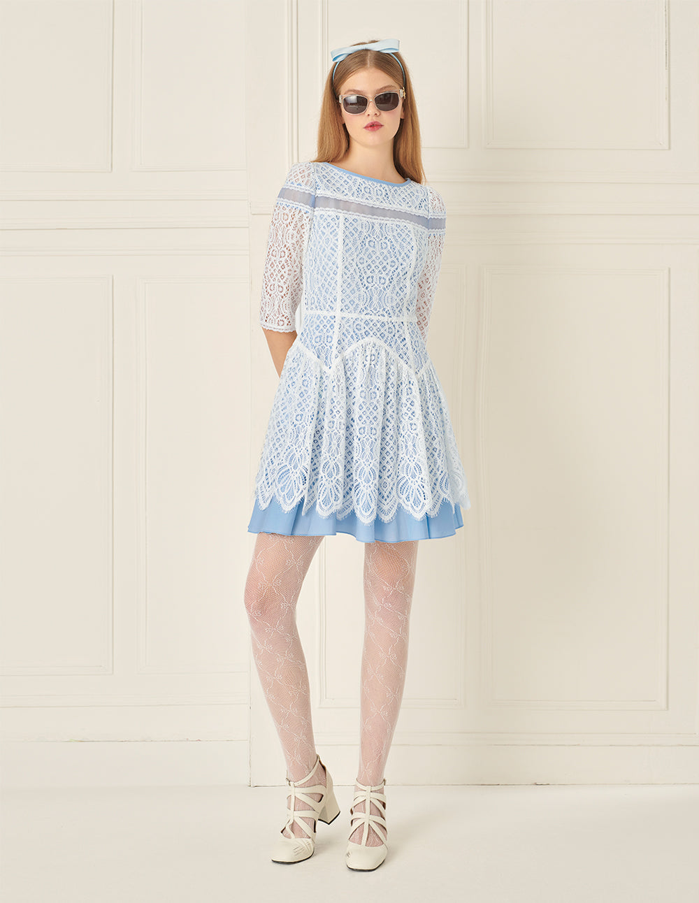 This dress is crafted from lightweight and flexible lace fabric. The simple round neckline and delicate organza inserts create subtle layering. The soft aqua color, clear as water, beautifully complements the pure white lace, evoking an effortlessly smooth and graceful palace-inspired style.