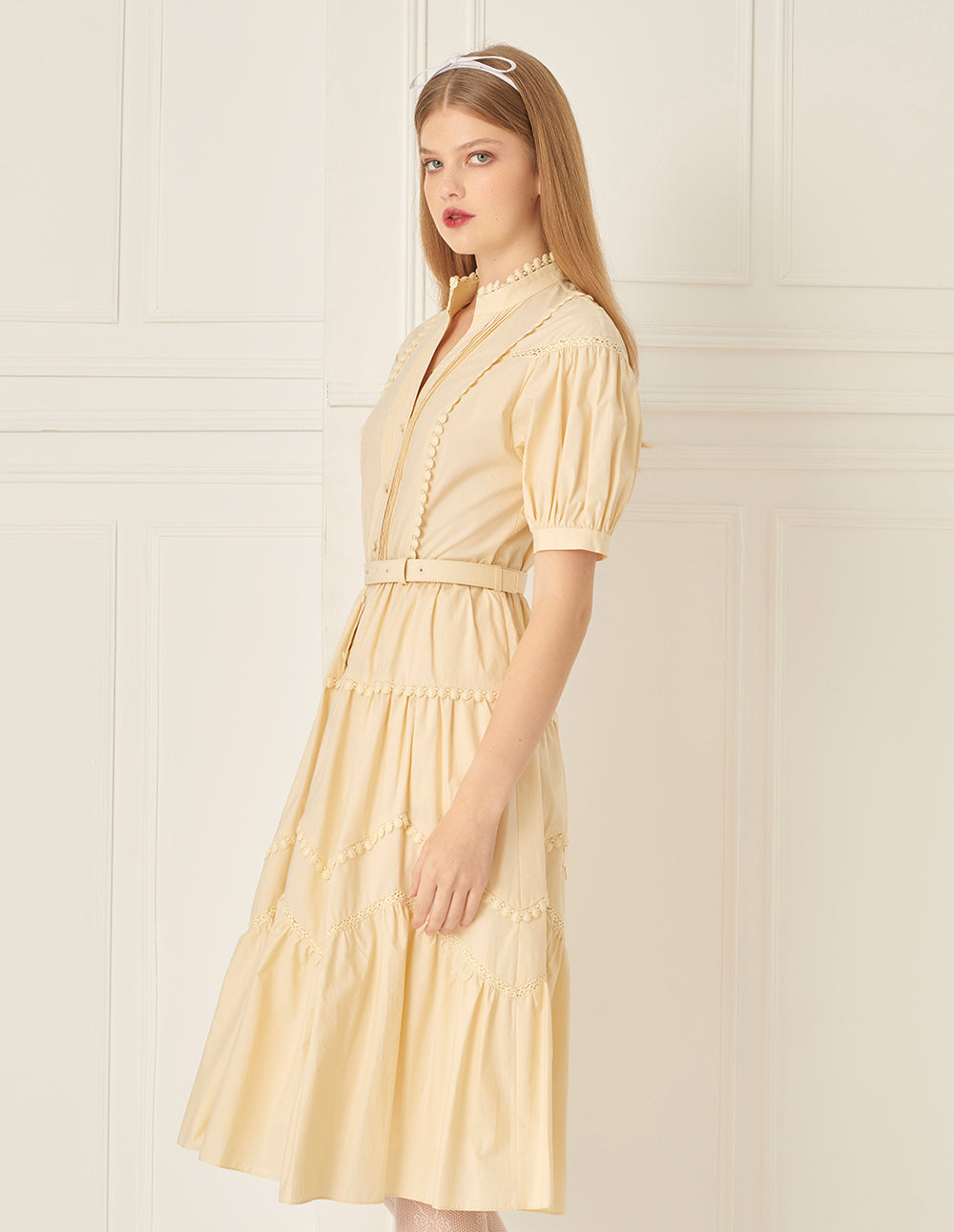 This dress features a shirt-inspired V-neck that accentuates the neckline. Multiple tiered layers are trimmed with delicate lace for a playful twist, making it a versatile piece for both the office and evening wear.