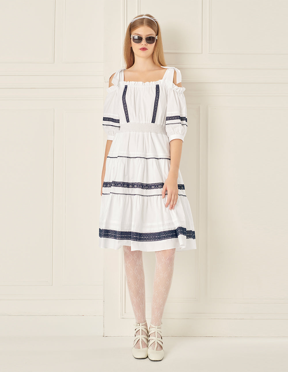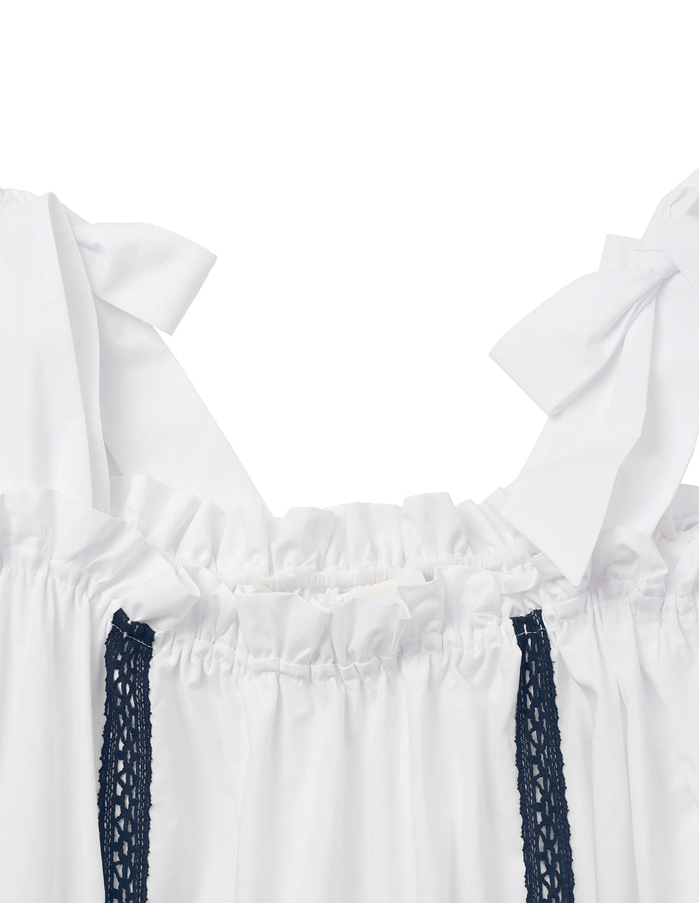 This dress is made from comfortable cotton fabric, adorned with contrasting navy lace for a simple yet elegant look. The one-shoulder collar and bow strap design add a graceful, sweet touch, perfect for a romantic summer vibe.